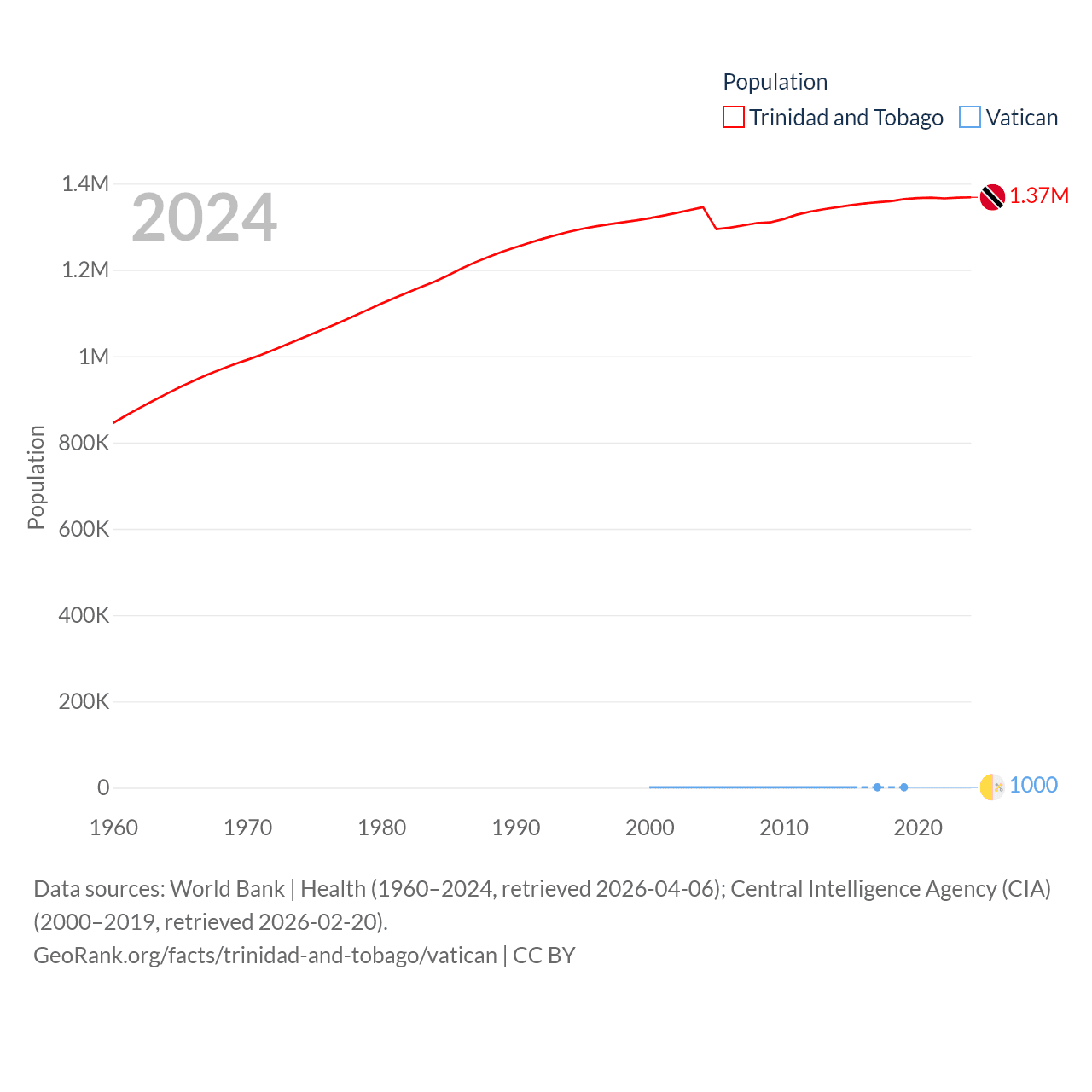 Trinidad and Tobago has a population of 1.37M (ranked 154/197), compared with 1K in The Vatican (ranked 197/197). Trinidad and Tobago's land area is 1,981 sq mi versus 0.17 sq mi for The Vatican (ranked 166th vs. 197th).