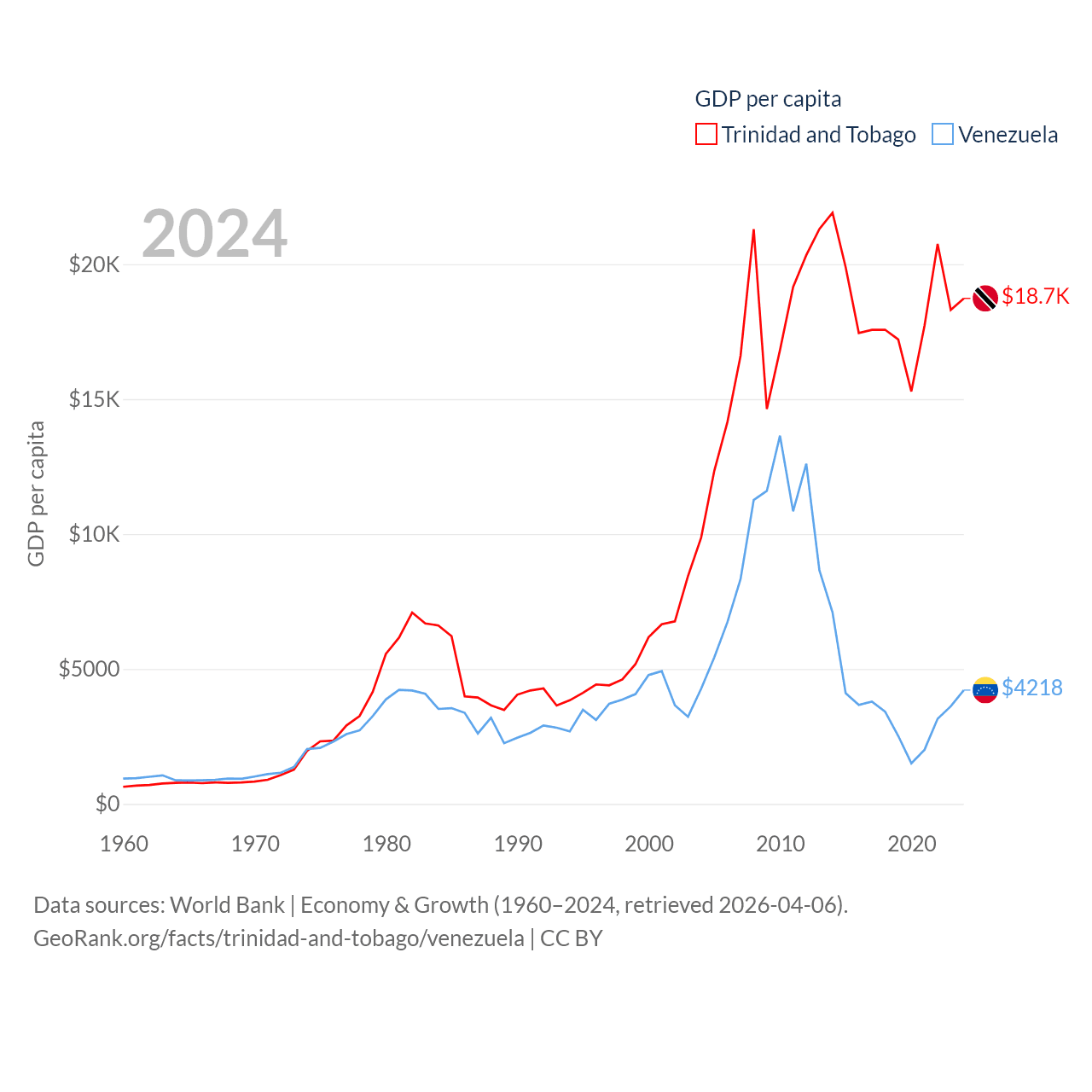 By GDP, Trinidad and Tobago ranks 115/197 ($25.6B) and Venezuela ranks 65/197 ($120B). By GDP per capita, Trinidad and Tobago ranks 61/197 ($18,733), while Venezuela ranks 128/197 ($4,218).
