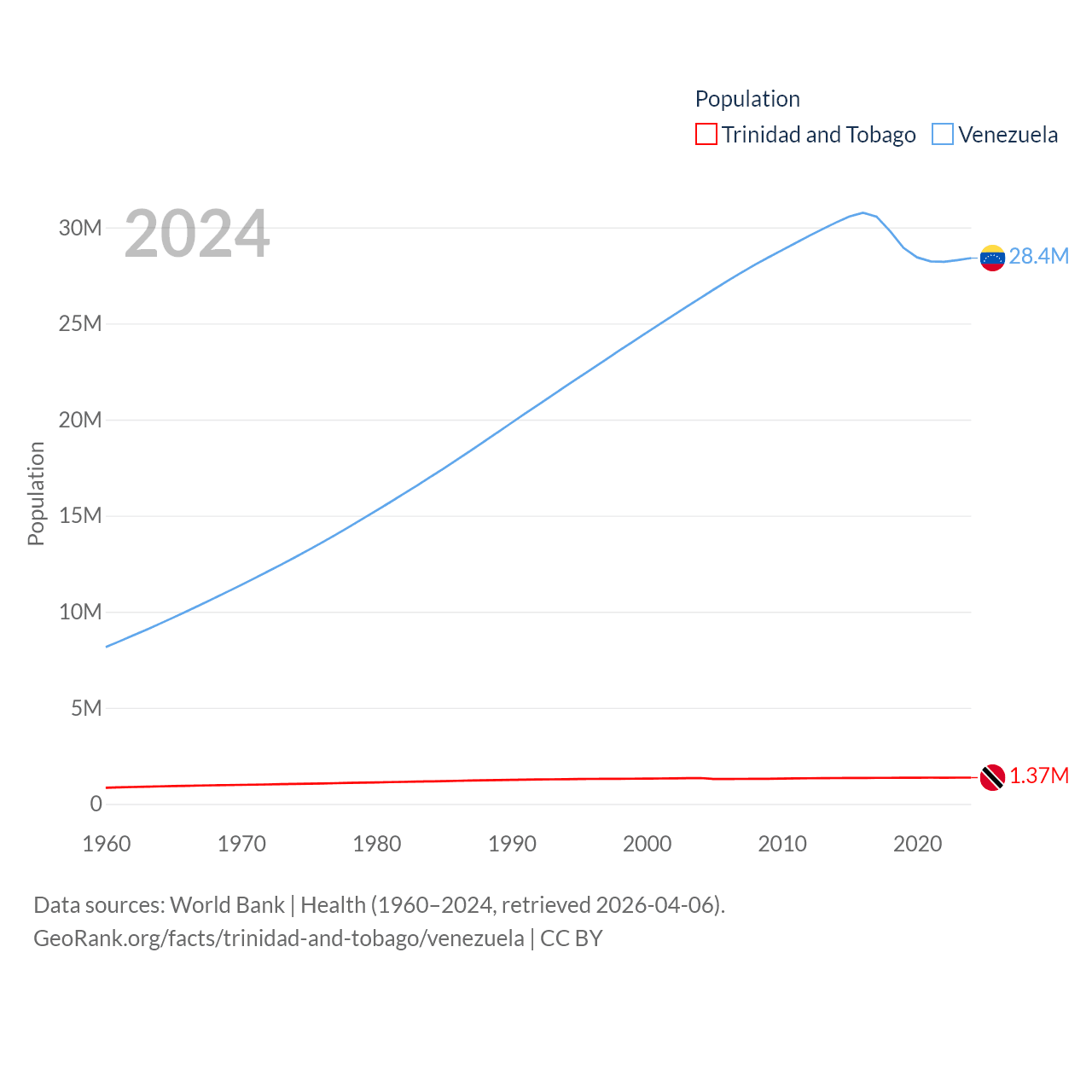 Trinidad and Tobago has a population of 1.37M (ranked 154/197), compared with 28.4M in Venezuela (ranked 53/197). Trinidad and Tobago's land area is 1,981 sq mi versus 340,561 sq mi for Venezuela (ranked 166th vs. 32nd).