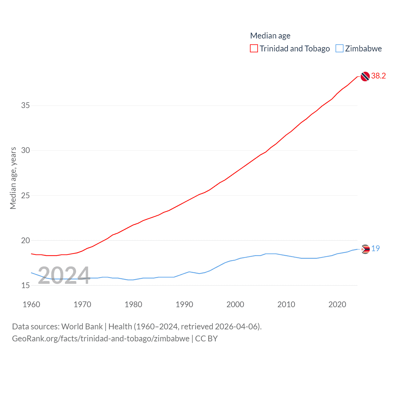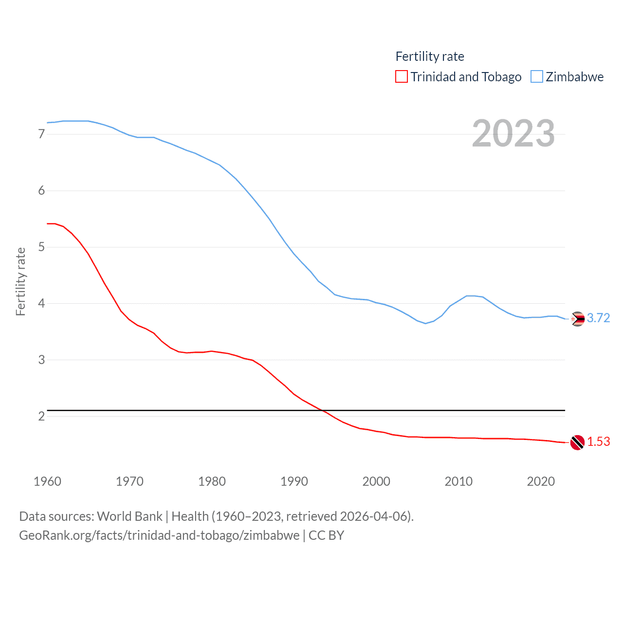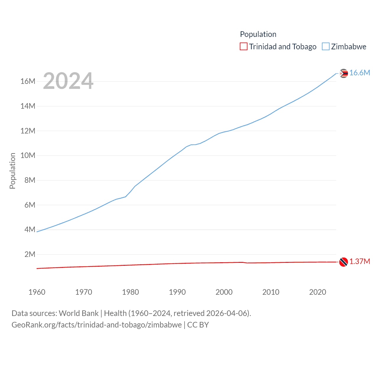 Trinidad and Tobago has a population of 1.37M (ranked 154/197), compared with 16.6M in Zimbabwe (ranked 74/197). Trinidad and Tobago's land area is 1,981 sq mi versus 149,364 sq mi for Zimbabwe (ranked 166th vs. 60th).