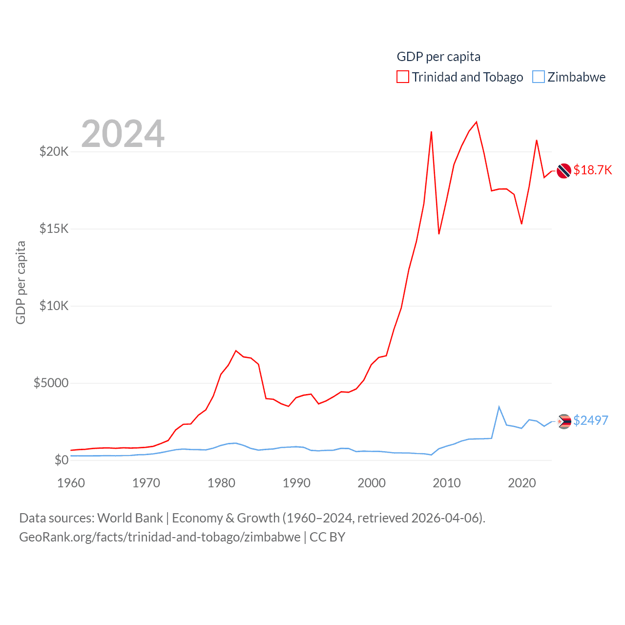 By GDP, Trinidad and Tobago ranks 115/197 ($25.6B) and Zimbabwe ranks 102/197 ($41.5B). By GDP per capita, Trinidad and Tobago ranks 61/197 ($18,733), while Zimbabwe ranks 148/197 ($2,497).