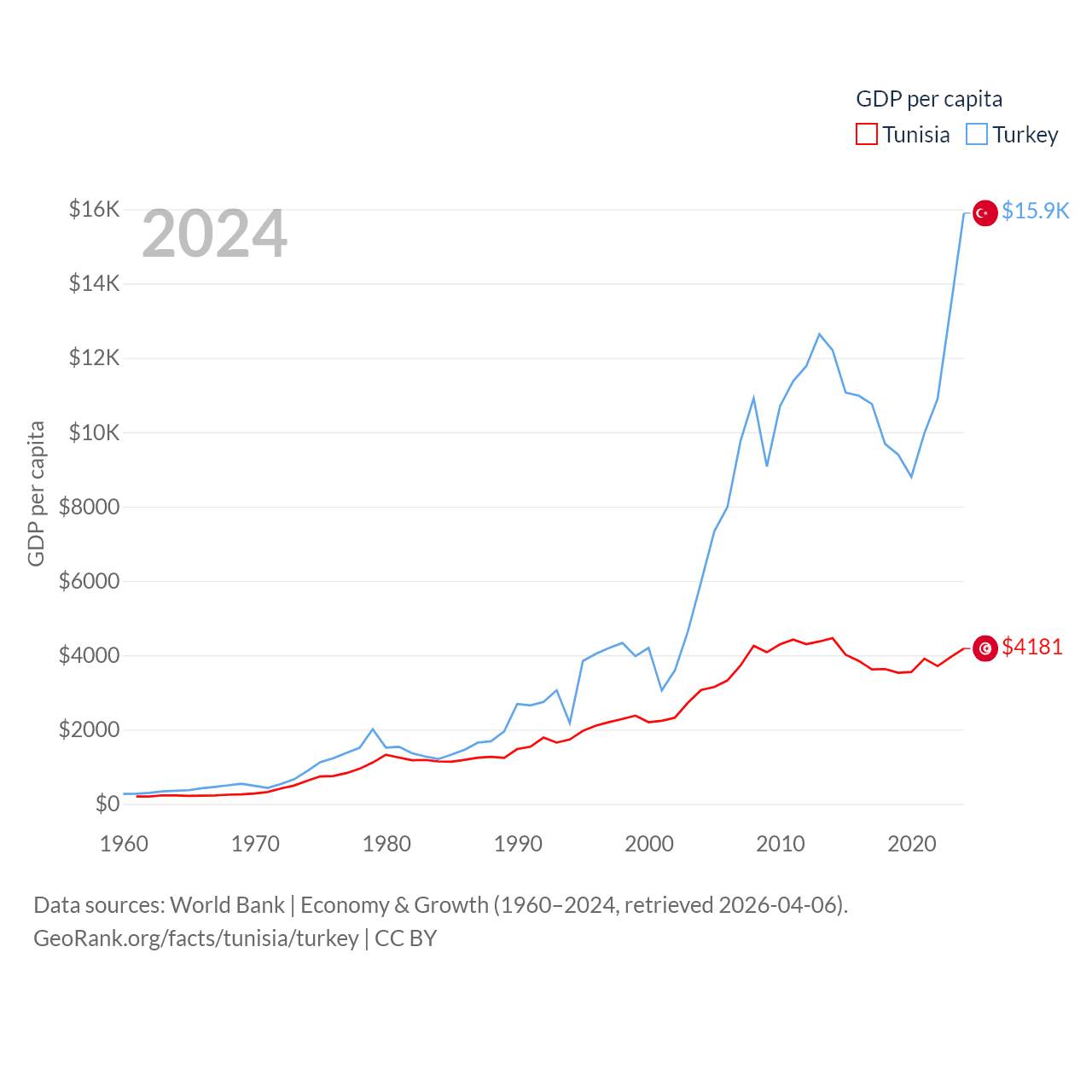 By GDP, Tunisia ranks 93/197 ($51.3B) and Turkey ranks 17/197 ($1.36T). By GDP per capita, Tunisia ranks 129/197 ($4,181), while Turkey ranks 66/197 ($15,893).