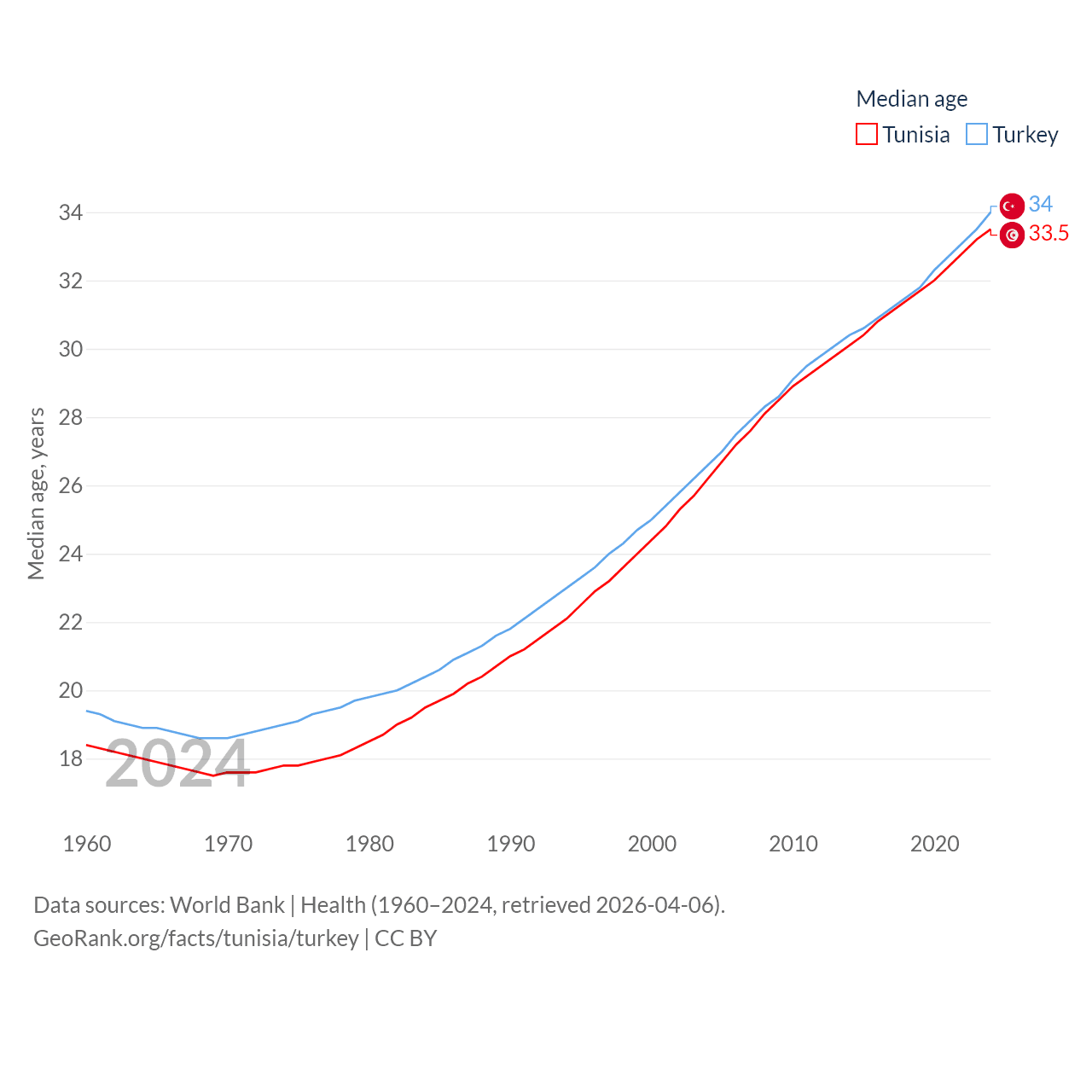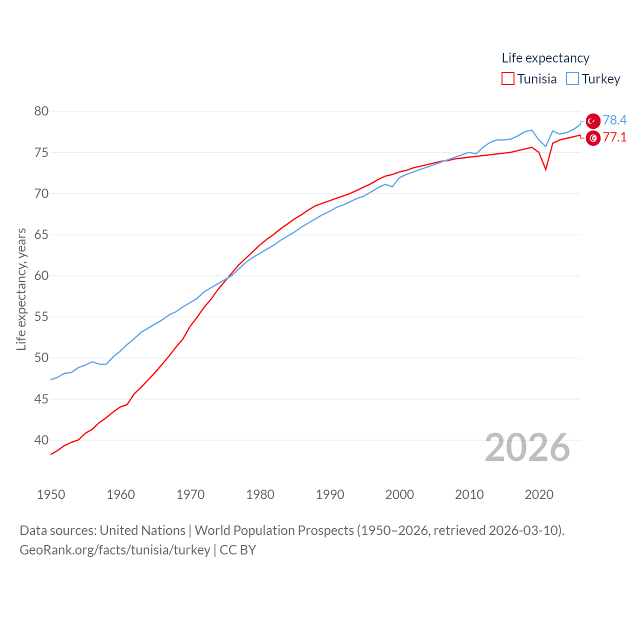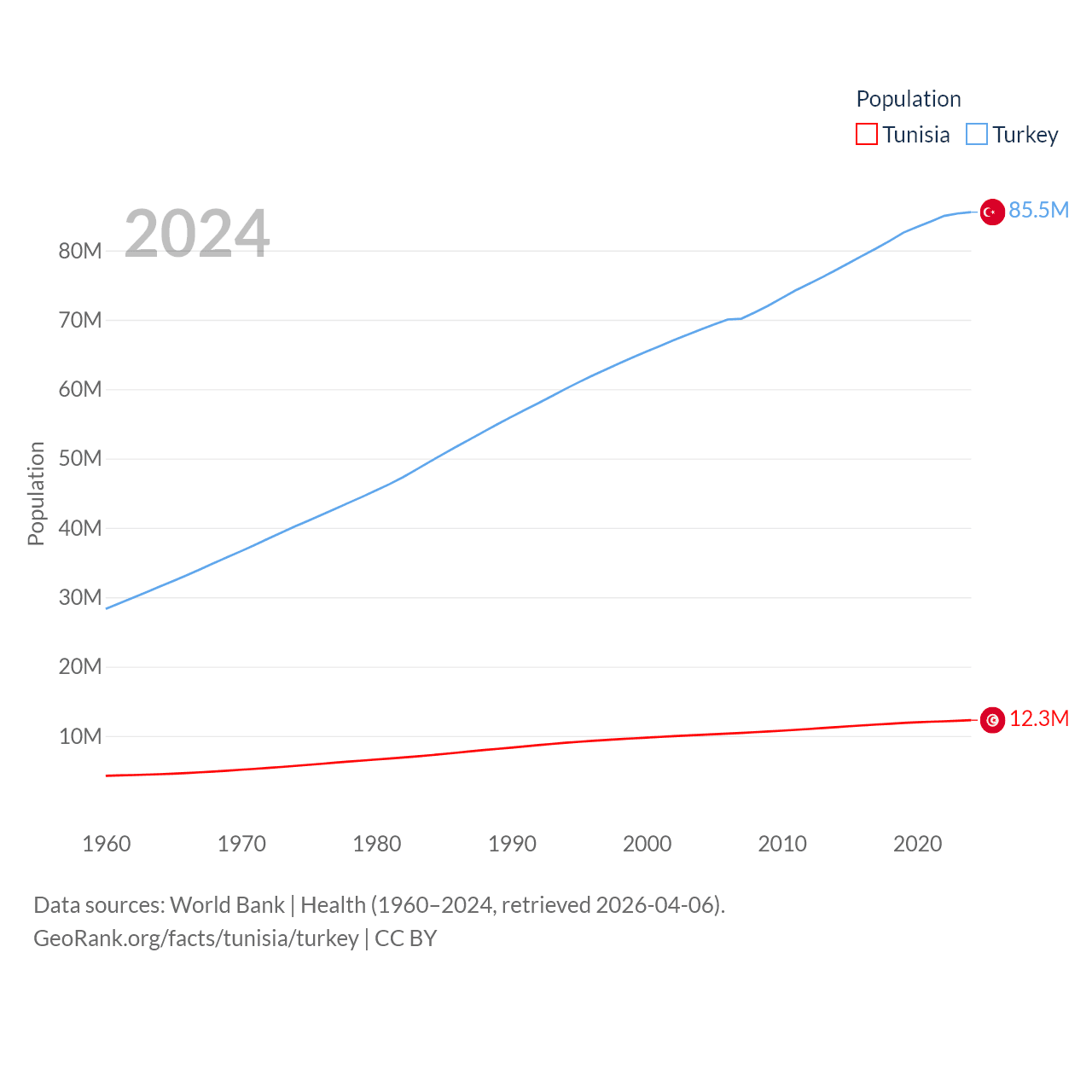 Tunisia has a population of 12.3M (ranked 80/197), compared with 85.5M in Turkey (ranked 18/197). Tunisia's land area is 59,985 sq mi versus 297,156 sq mi for Turkey (ranked 91st vs. 36th).