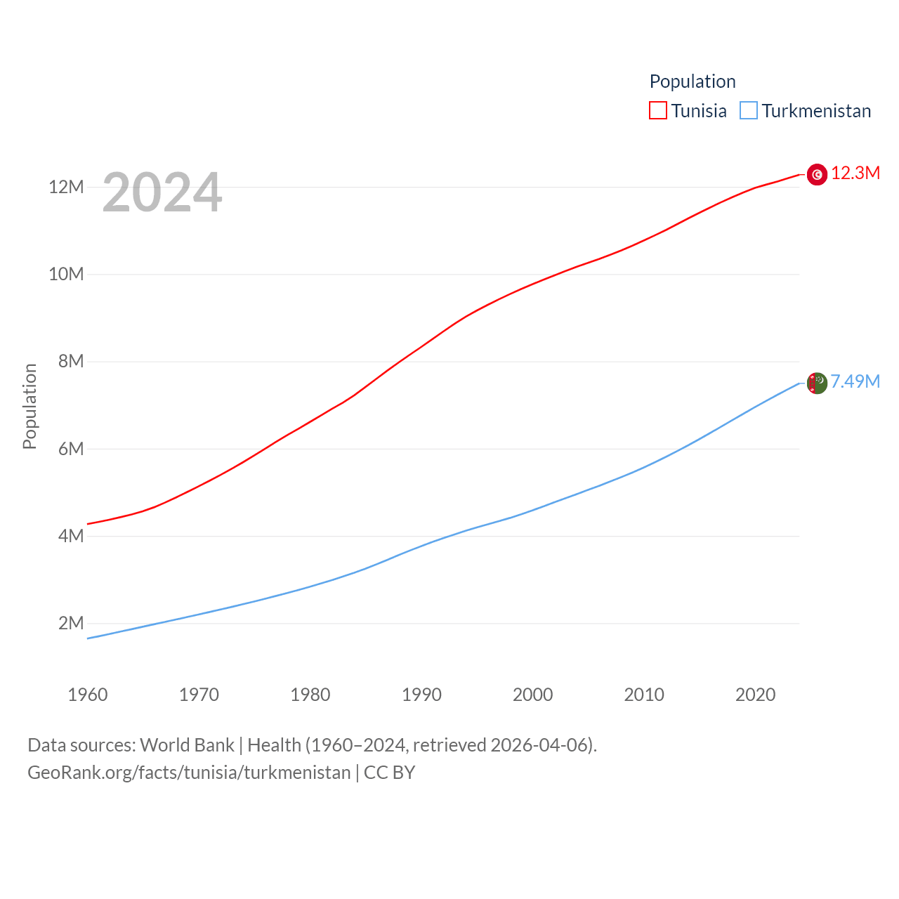 Tunisia has a population of 12.3M (ranked 80/197), compared with 7.49M in Turkmenistan (ranked 104/197). Tunisia's land area is 59,985 sq mi versus 181,441 sq mi for Turkmenistan (ranked 91st vs. 53rd).