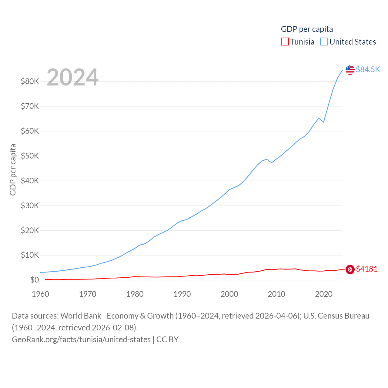By GDP, Tunisia ranks 93/197 ($51.3B) and The United States ranks 1/197 ($28.8T). By GDP per capita, Tunisia ranks 129/197 ($4,181), while The United States ranks 10/197 ($84,534).