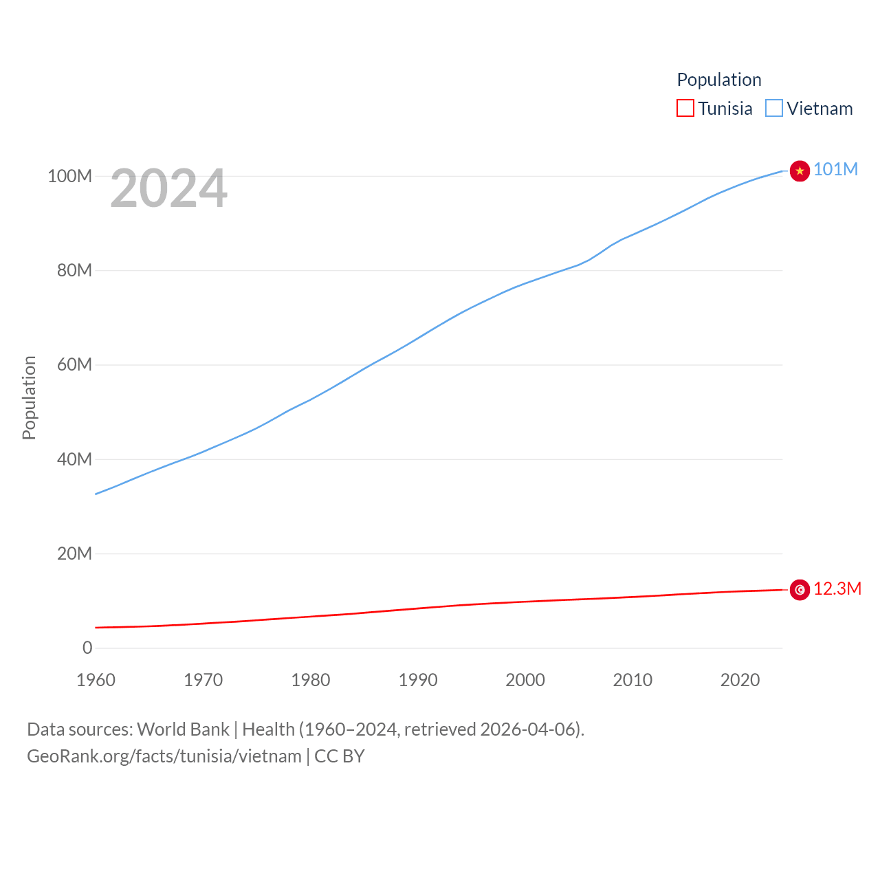 Tunisia has a population of 12.3M (ranked 80/197), compared with 101M in Vietnam (ranked 16/197). Tunisia's land area is 59,985 sq mi versus 121,016 sq mi for Vietnam (ranked 91st vs. 67th).