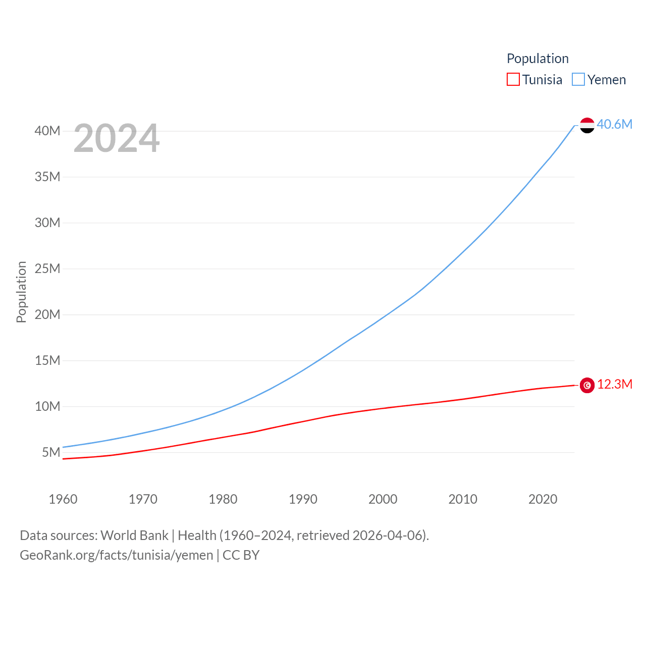 Tunisia has a population of 12.3M (ranked 80/197), compared with 40.6M in Yemen (ranked 38/197). Tunisia's land area is 59,985 sq mi versus 203,850 sq mi for Yemen (ranked 91st vs. 49th).