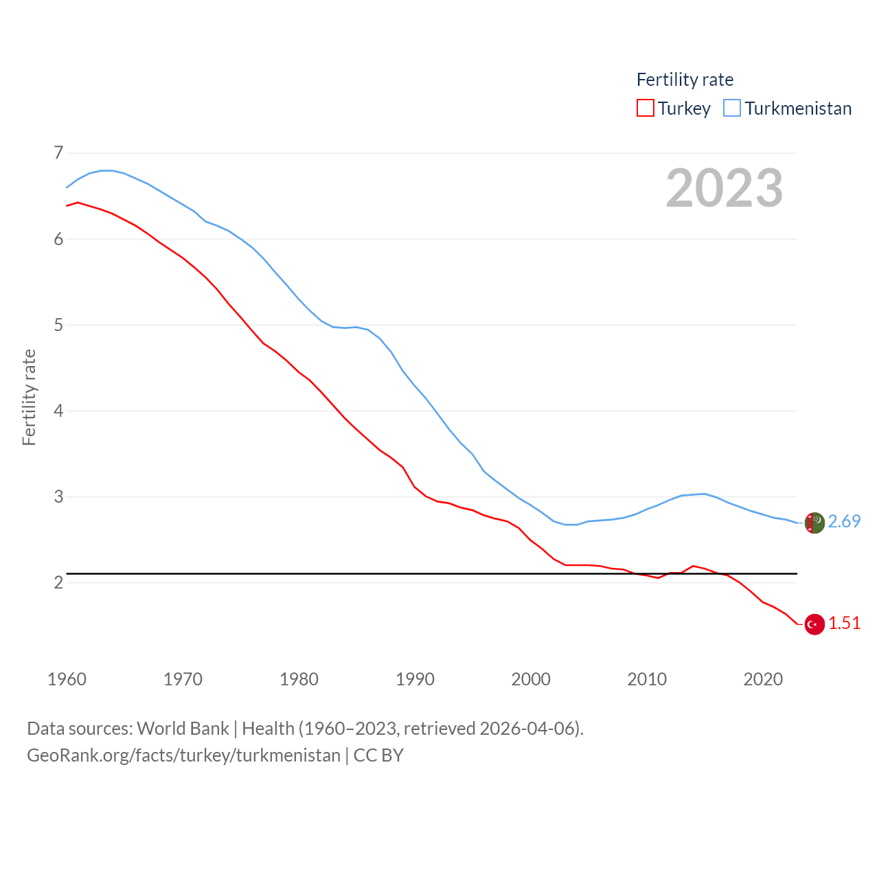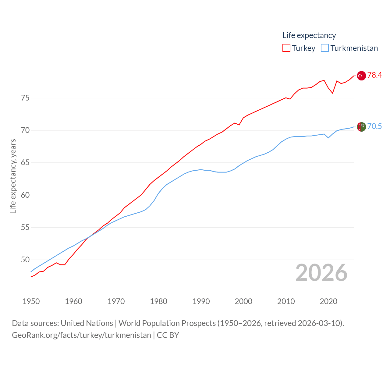 Turkey has a population of 85.5M (ranked 18/197), compared with 7.49M in Turkmenistan (ranked 104/197). Turkey's land area is 297,156 sq mi versus 181,441 sq mi for Turkmenistan (ranked 36th vs. 53rd).