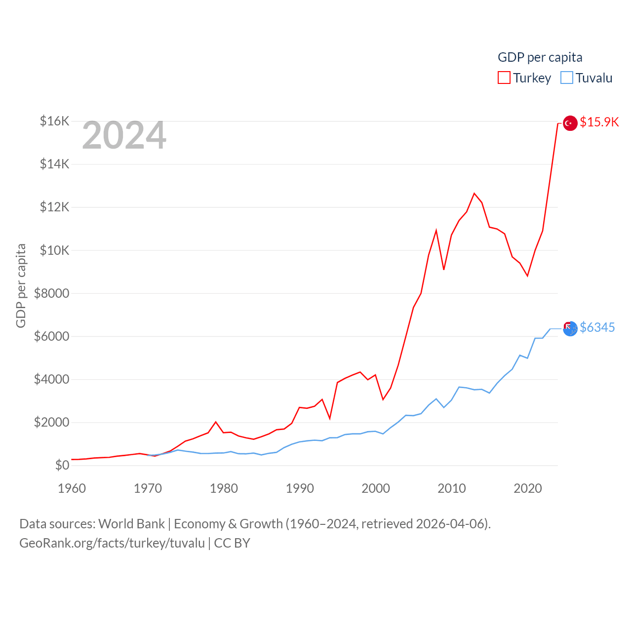 By GDP, Turkey ranks 17/197 ($1.36T) and Tuvalu ranks 196/197 ($62.3M). By GDP per capita, Turkey ranks 66/197 ($15,893), while Tuvalu ranks 110/197 ($6,345).