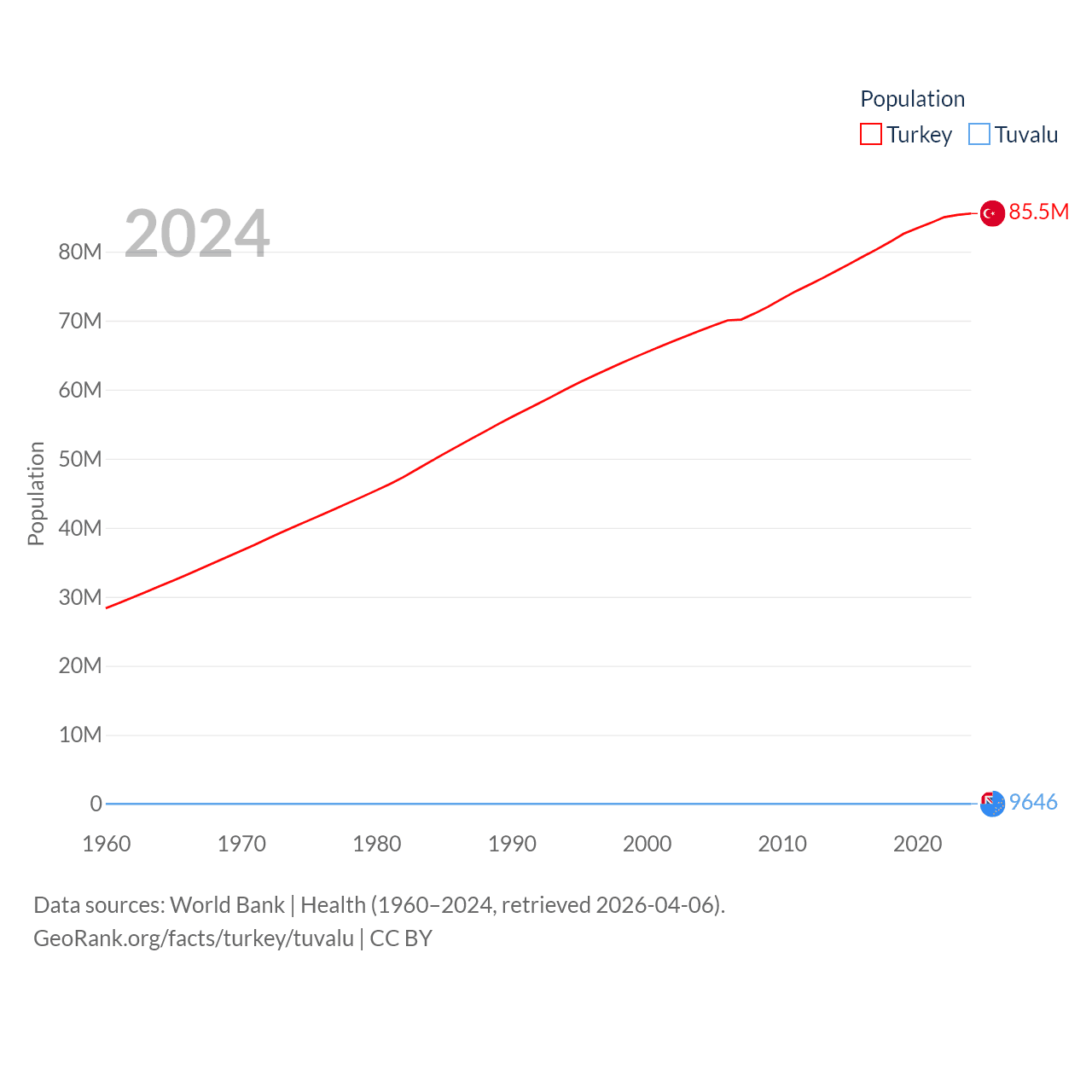Turkey has a population of 85.5M (ranked 18/197), compared with 9.65K in Tuvalu (ranked 196/197). Turkey's land area is 297,156 sq mi versus 11.6 sq mi for Tuvalu (ranked 36th vs. 194th).