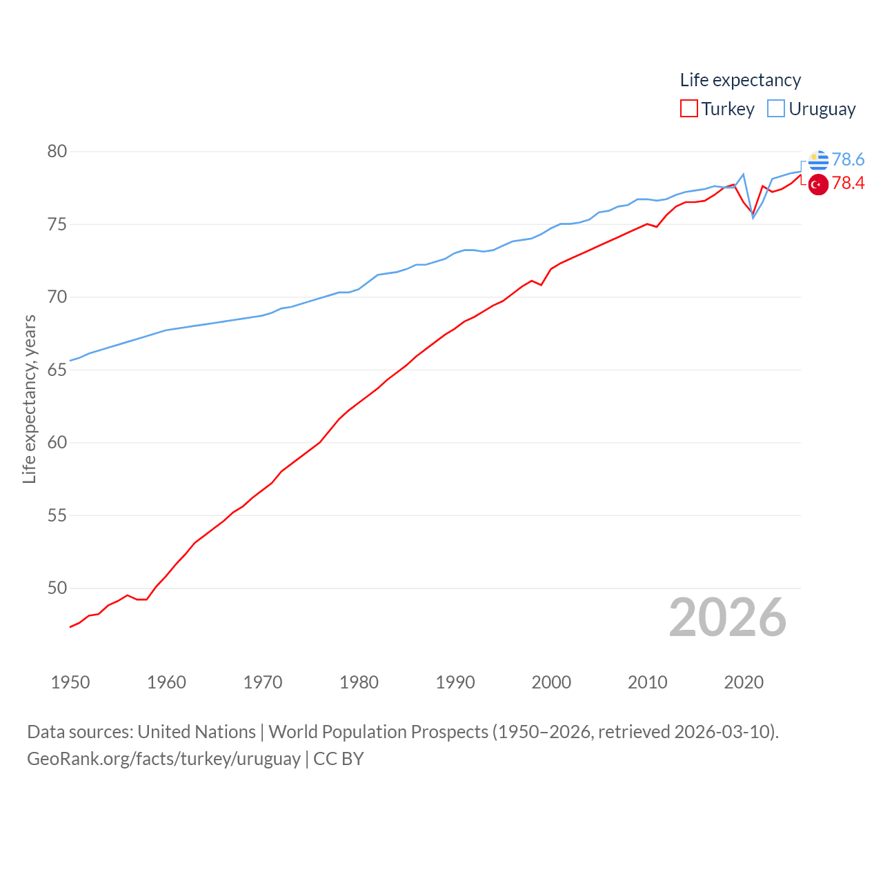 Turkey has a population of 85.5M (ranked 18/197), compared with 3.39M in Uruguay (ranked 133/197). Turkey's land area is 297,156 sq mi versus 67,576 sq mi for Uruguay (ranked 36th vs. 89th).