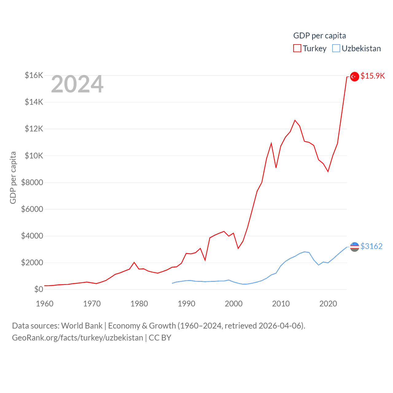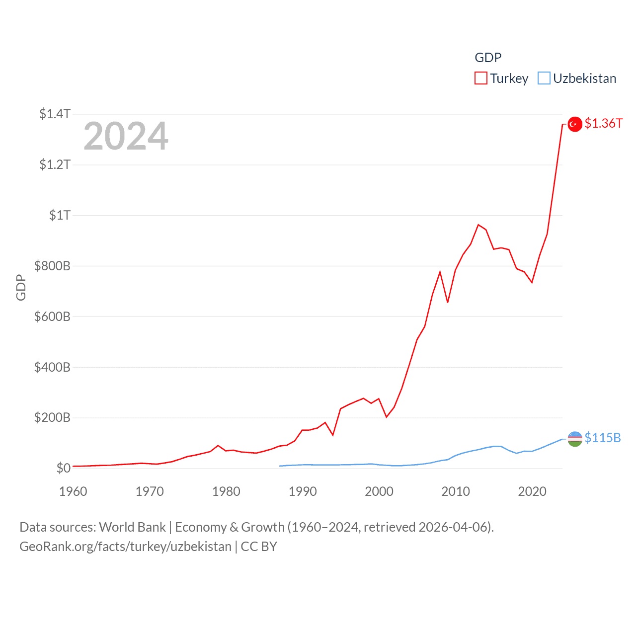 By GDP, Turkey ranks 17/197 ($1.36T) and Uzbekistan ranks 66/197 ($115B). By GDP per capita, Turkey ranks 66/197 ($15,893), while Uzbekistan ranks 139/197 ($3,162).