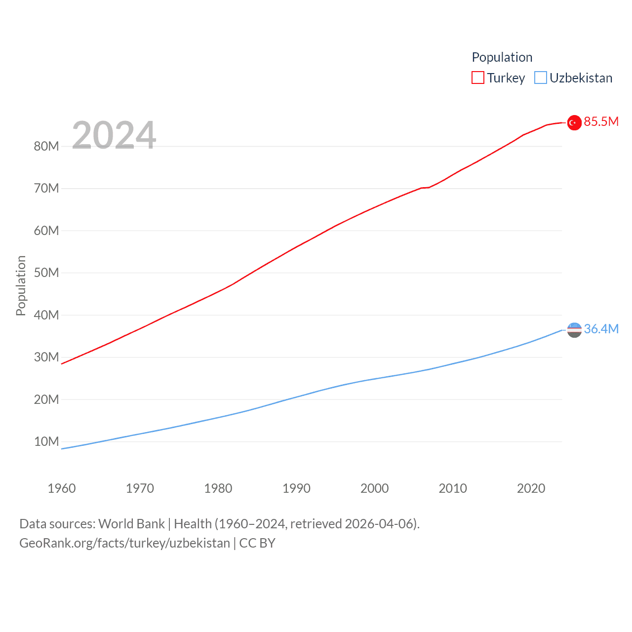 Turkey has a population of 85.5M (ranked 18/197), compared with 36.4M in Uzbekistan (ranked 43/197). Turkey's land area is 297,156 sq mi versus 170,136 sq mi for Uzbekistan (ranked 36th vs. 56th).