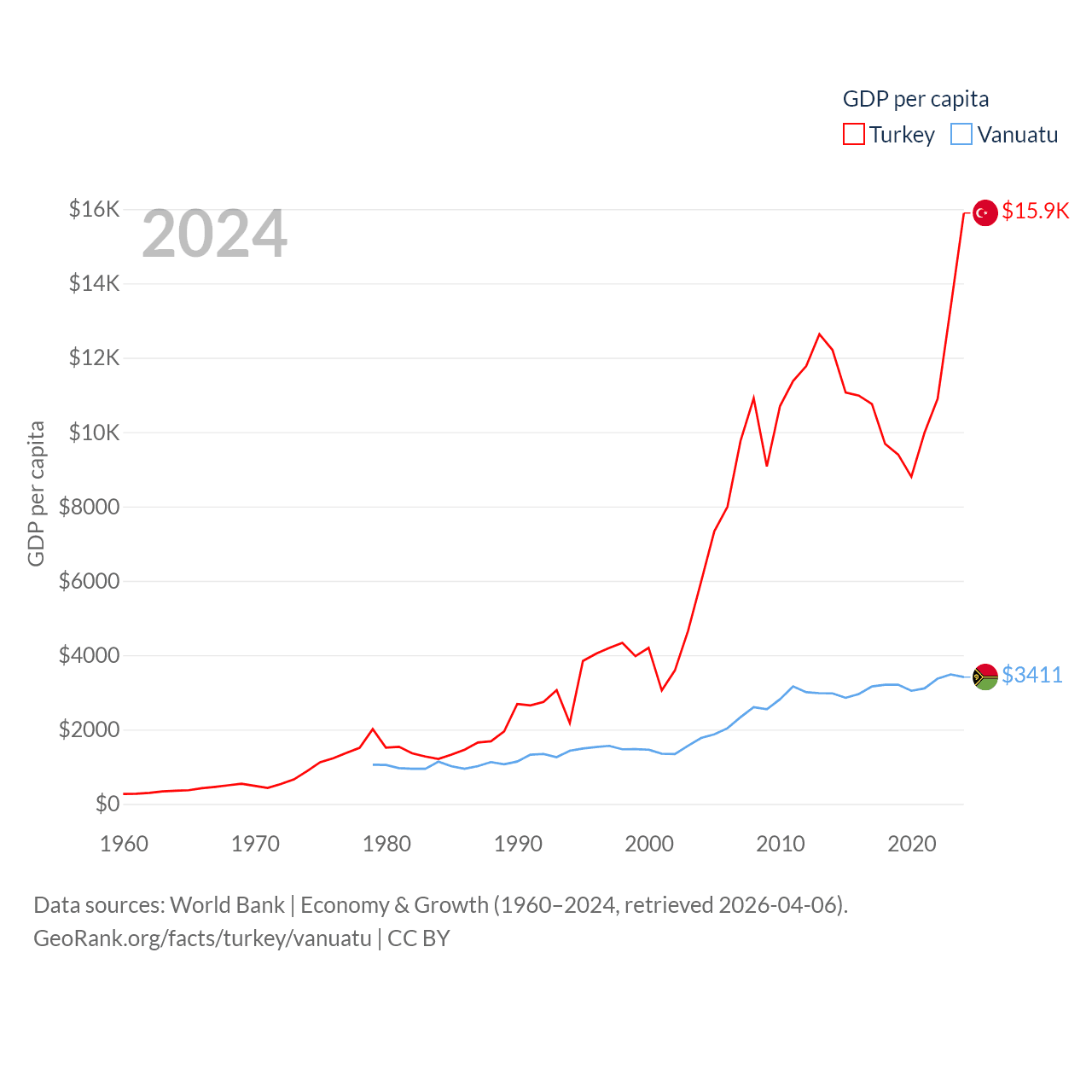 By GDP, Turkey ranks 17/197 ($1.36T) and Vanuatu ranks 188/197 ($1.12B). By GDP per capita, Turkey ranks 66/197 ($15,893), while Vanuatu ranks 137/197 ($3,411).