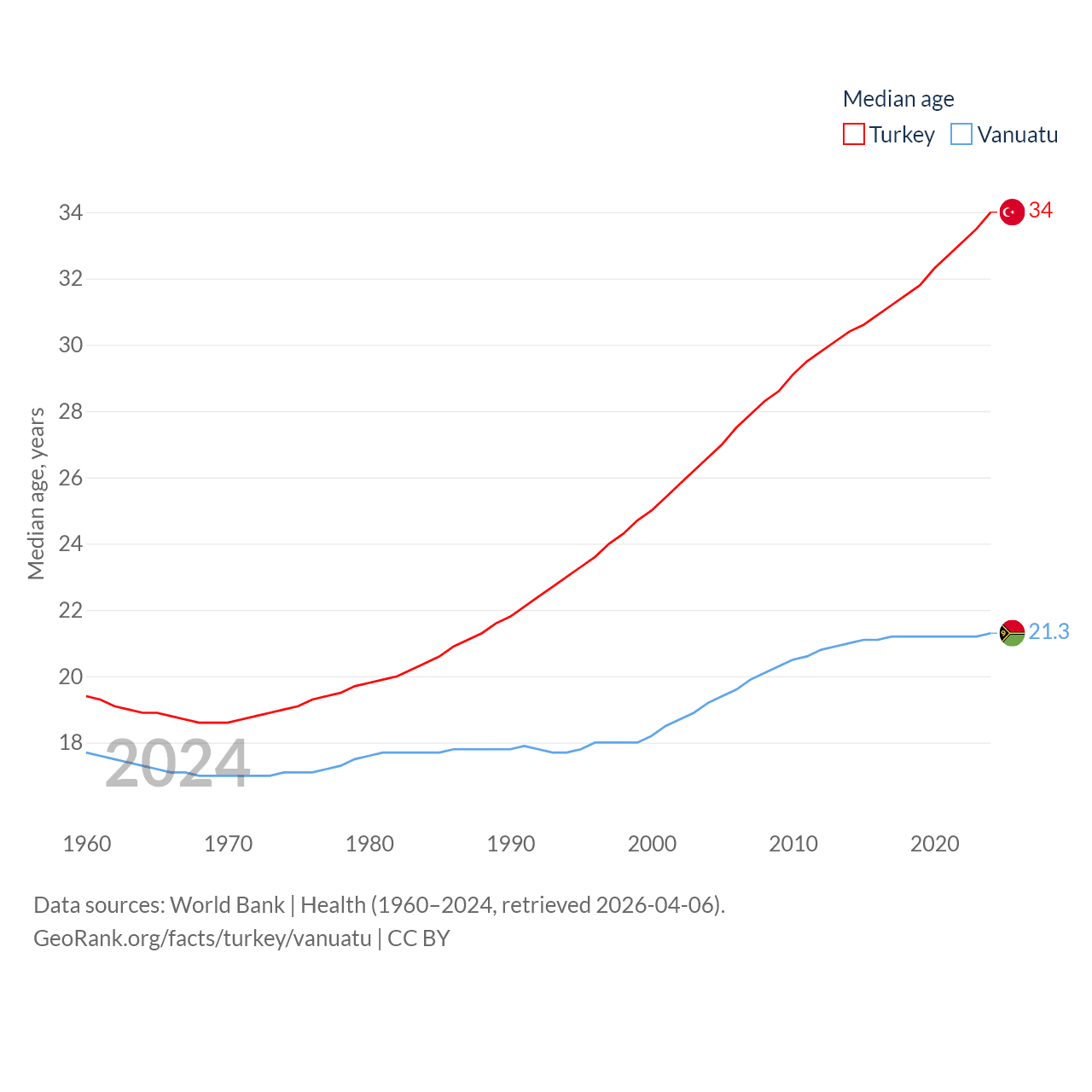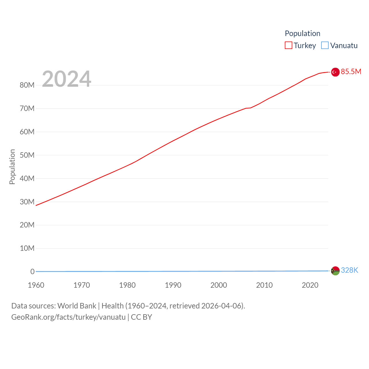 Turkey has a population of 85.5M (ranked 18/197), compared with 328K in Vanuatu (ranked 174/197). Turkey's land area is 297,156 sq mi versus 4,707 sq mi for Vanuatu (ranked 36th vs. 157th).