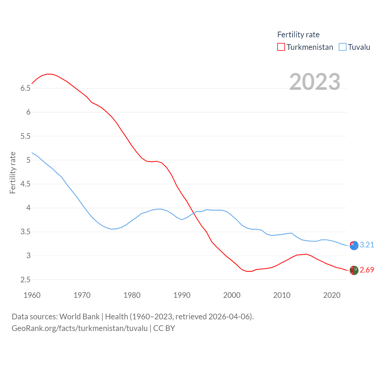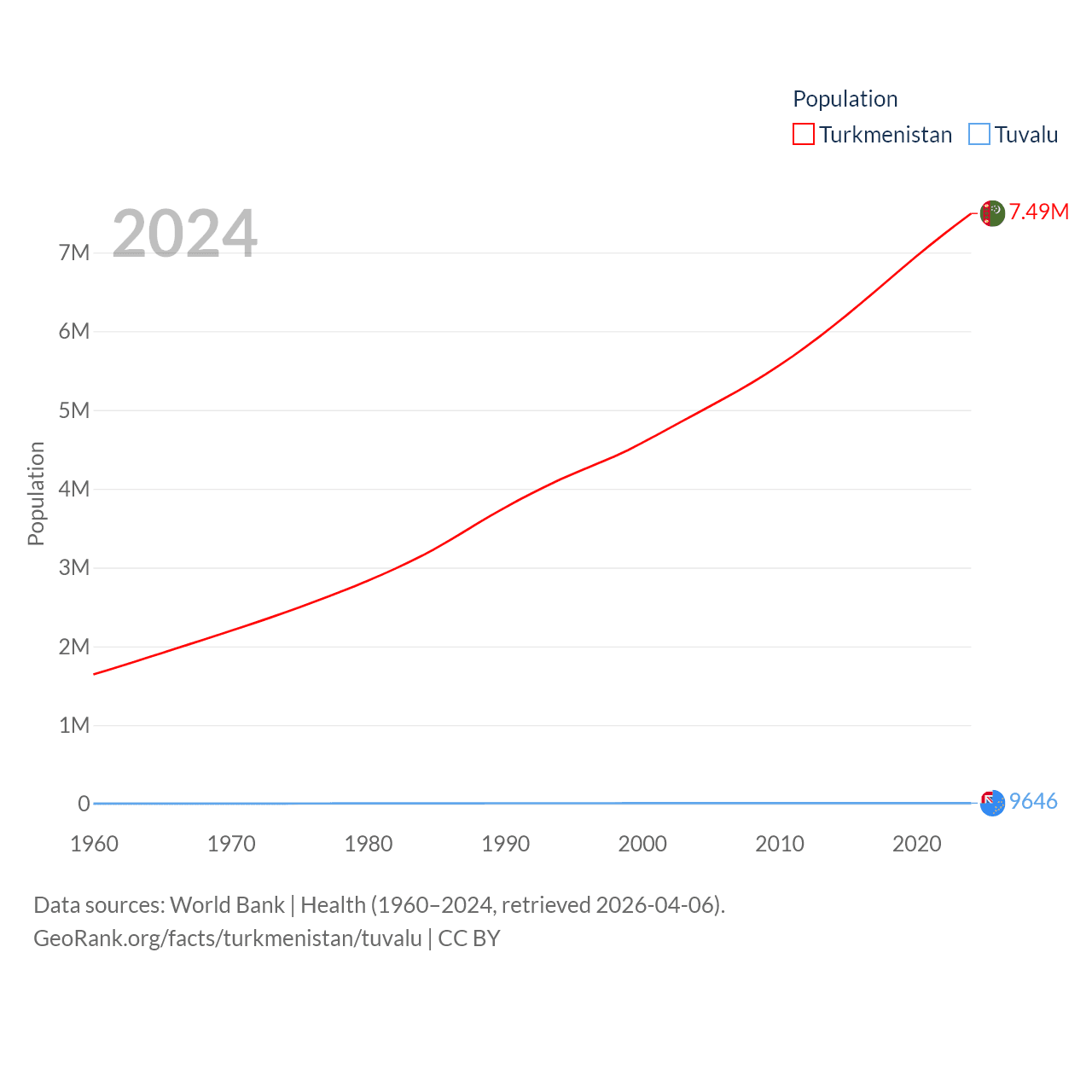 Turkmenistan has a population of 7.49M (ranked 104/197), compared with 9.65K in Tuvalu (ranked 196/197). Turkmenistan's land area is 181,441 sq mi versus 11.6 sq mi for Tuvalu (ranked 53rd vs. 194th).