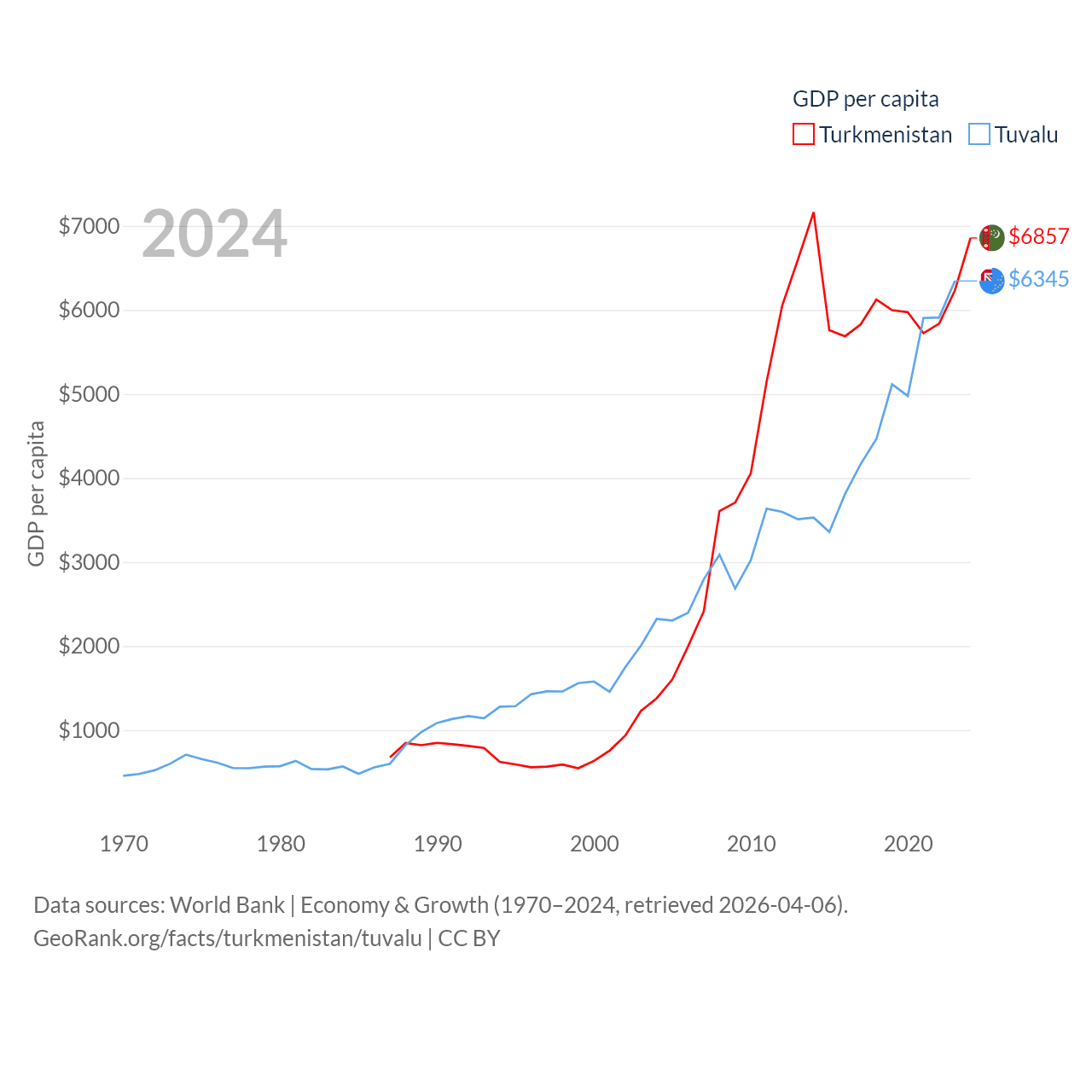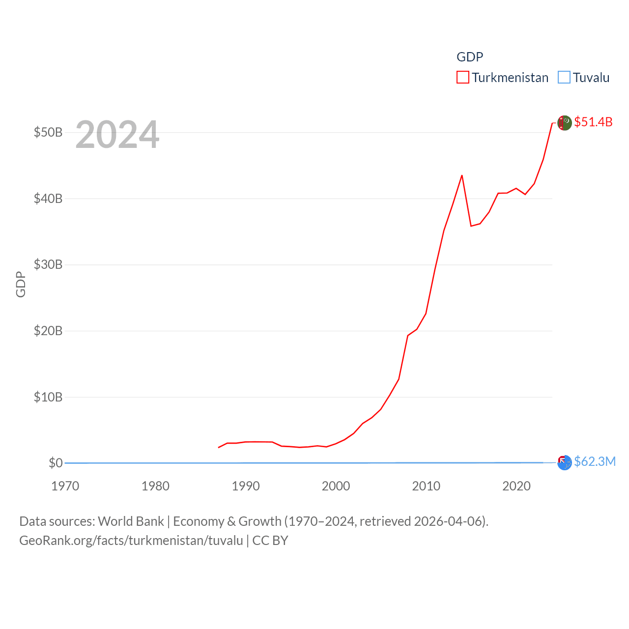 By GDP, Turkmenistan ranks 92/197 ($51.4B) and Tuvalu ranks 196/197 ($62.3M). By GDP per capita, Turkmenistan ranks 104/197 ($6,857), while Tuvalu ranks 110/197 ($6,345).