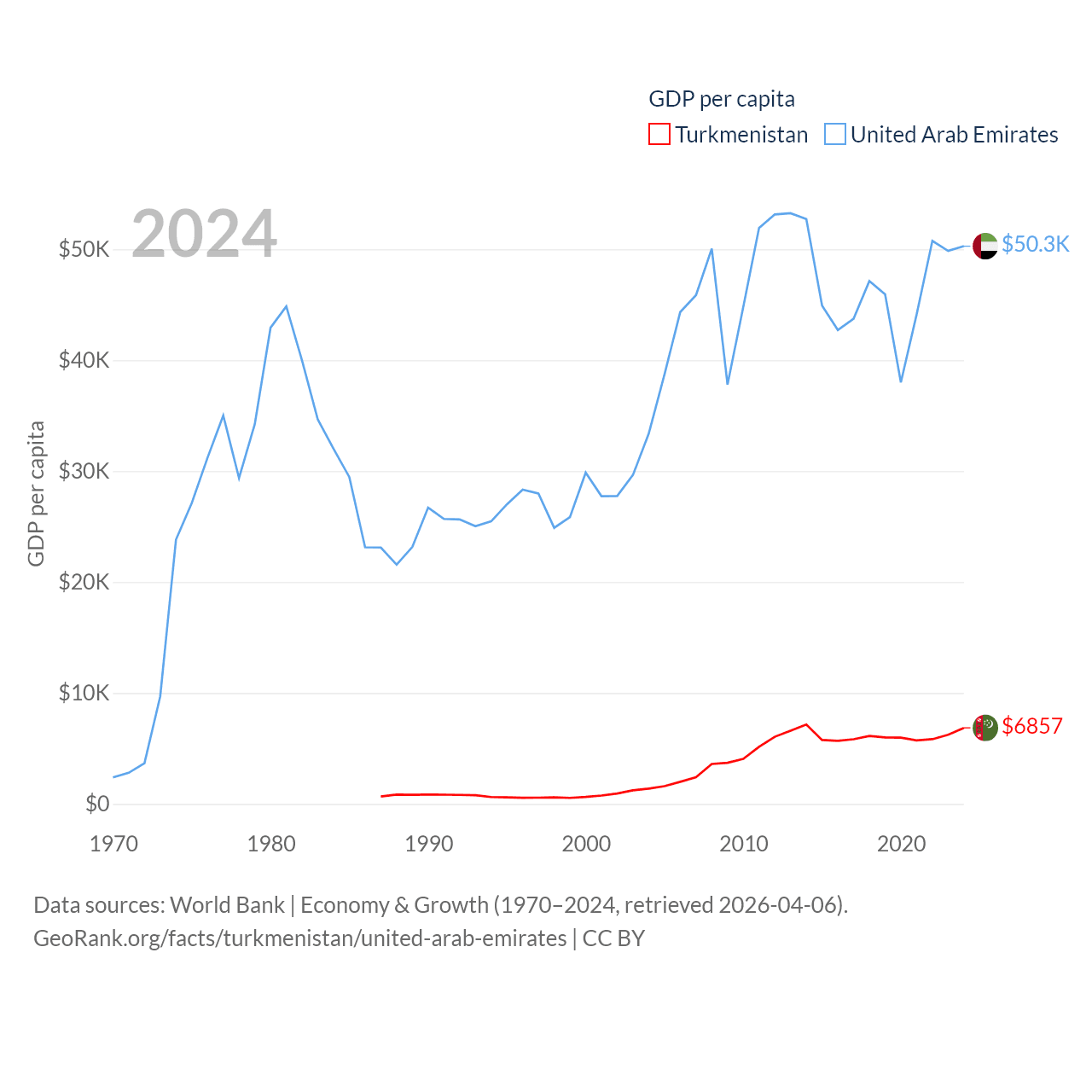 By GDP, Turkmenistan ranks 92/197 ($51.4B) and The United Arab Emirates ranks 27/197 ($552B). By GDP per capita, Turkmenistan ranks 104/197 ($6,857), while The United Arab Emirates ranks 24/197 ($50,274).