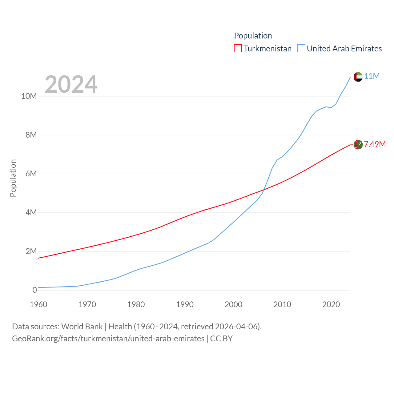 Turkmenistan has a population of 7.49M (ranked 104/197), compared with 11M in The United Arab Emirates (ranked 86/197). Turkmenistan's land area is 181,441 sq mi versus 27,421 sq mi for The United Arab Emirates (ranked 53rd vs. 117th).