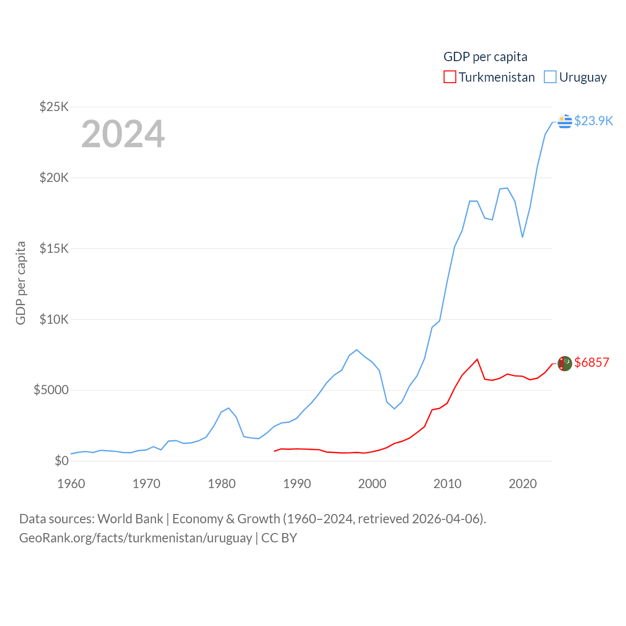 By GDP, Turkmenistan ranks 92/197 ($51.4B) and Uruguay ranks 81/197 ($81B). By GDP per capita, Turkmenistan ranks 104/197 ($6,857), while Uruguay ranks 52/197 ($23,907).