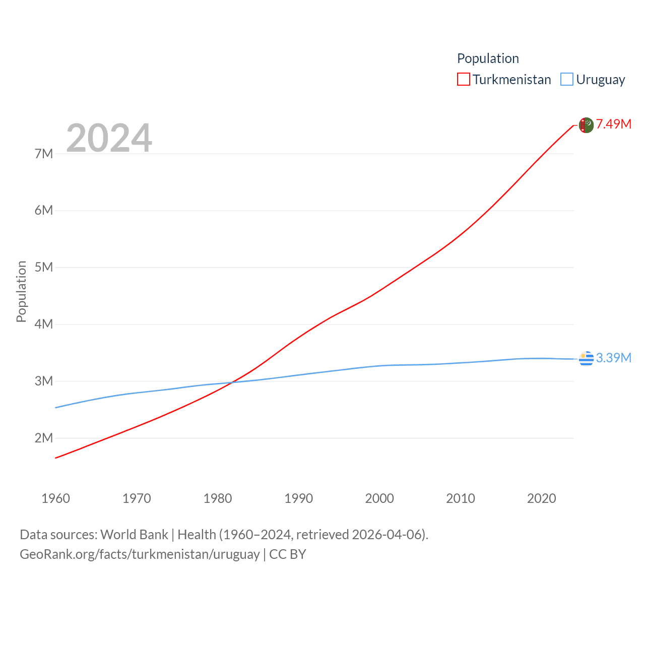 Turkmenistan has a population of 7.49M (ranked 104/197), compared with 3.39M in Uruguay (ranked 133/197). Turkmenistan's land area is 181,441 sq mi versus 67,576 sq mi for Uruguay (ranked 53rd vs. 89th).