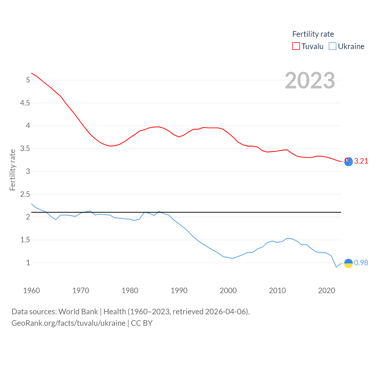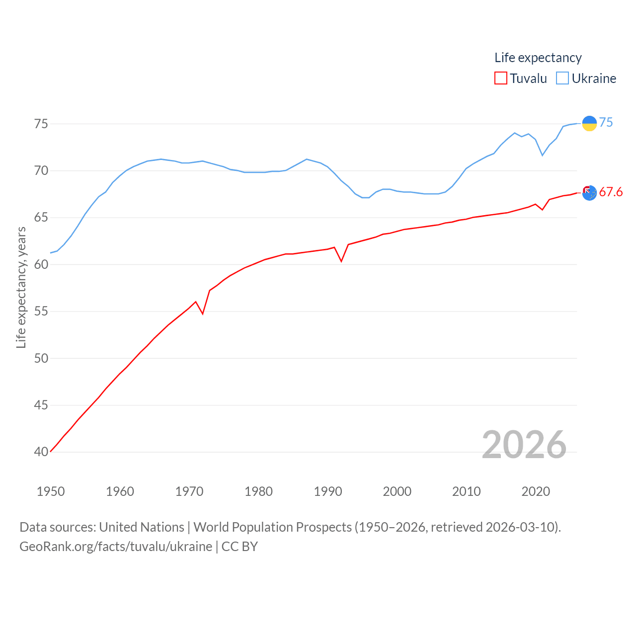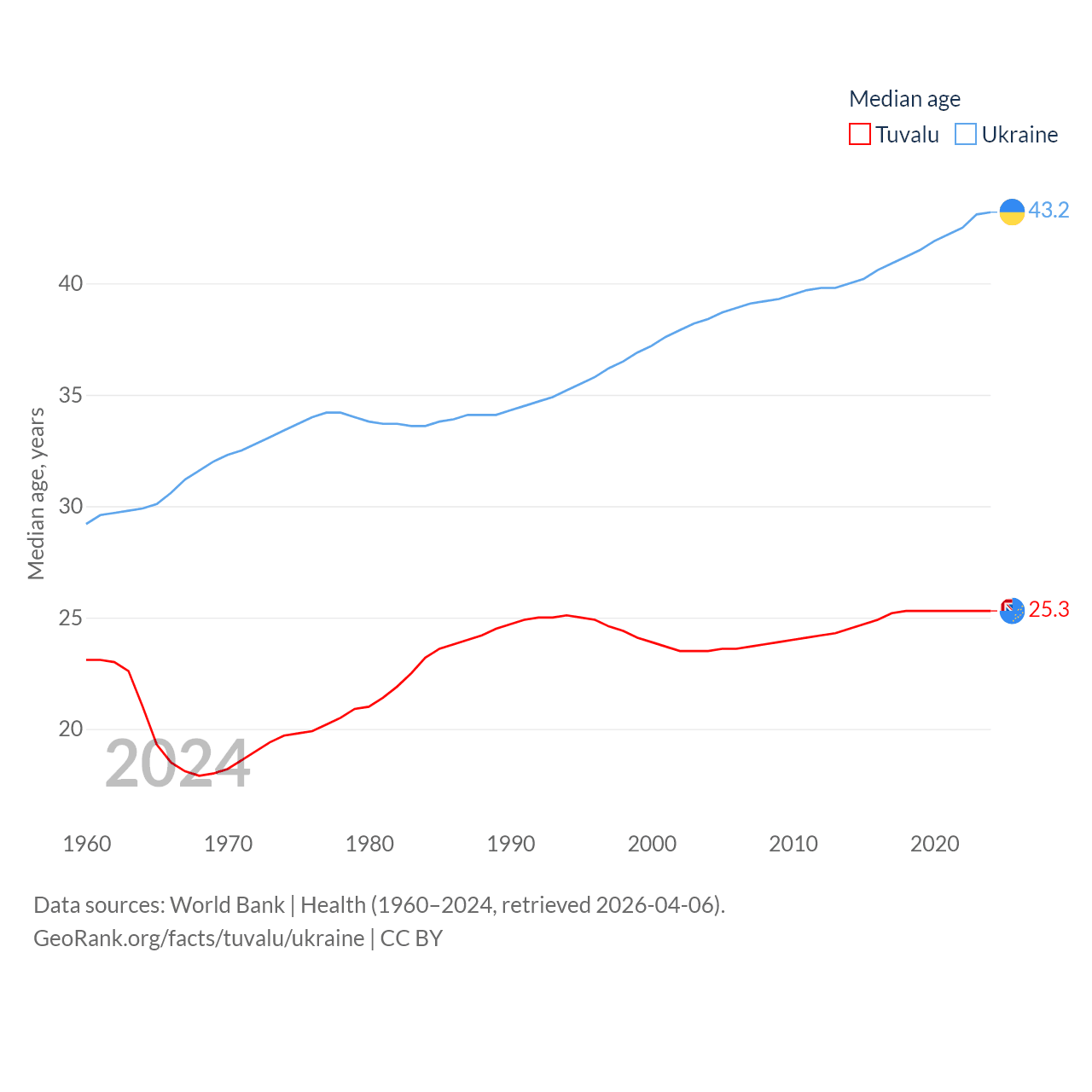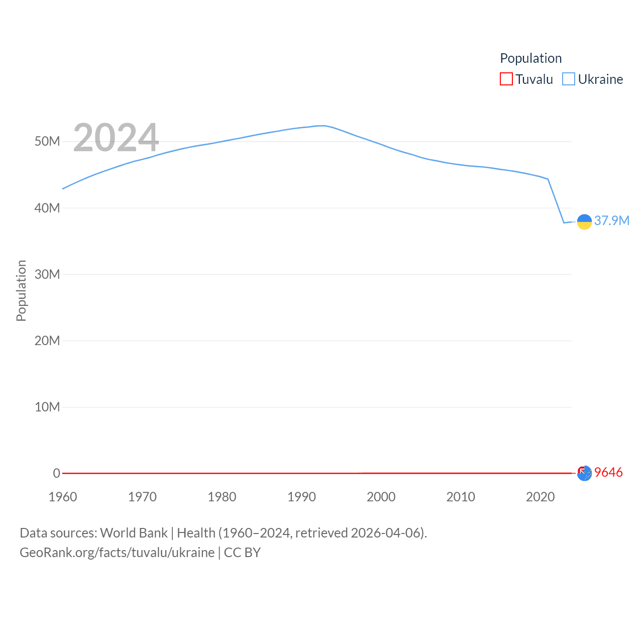 Tuvalu has a population of 9.65K (ranked 196/197), compared with 37.9M in Ukraine (ranked 41/197). Tuvalu's land area is 11.6 sq mi versus 223,708 sq mi for Ukraine (ranked 194th vs. 46th).