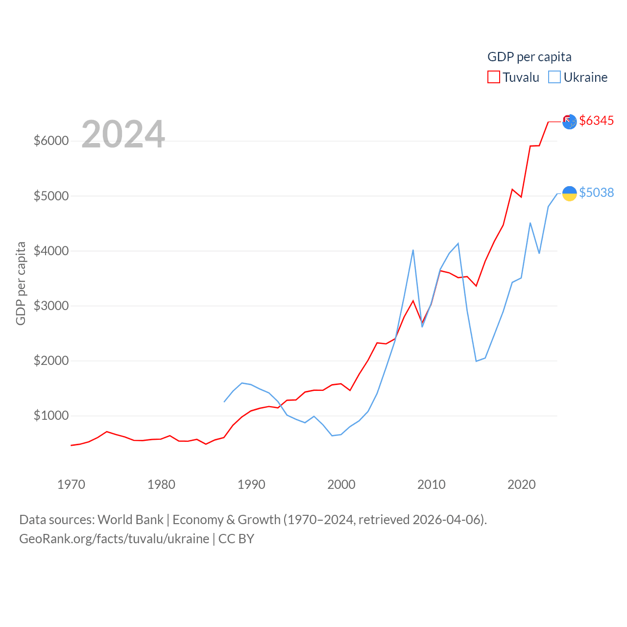 By GDP, Tuvalu ranks 196/197 ($62.3M) and Ukraine ranks 57/197 ($191B). By GDP per capita, Tuvalu ranks 110/197 ($6,345), while Ukraine ranks 120/197 ($5,038).