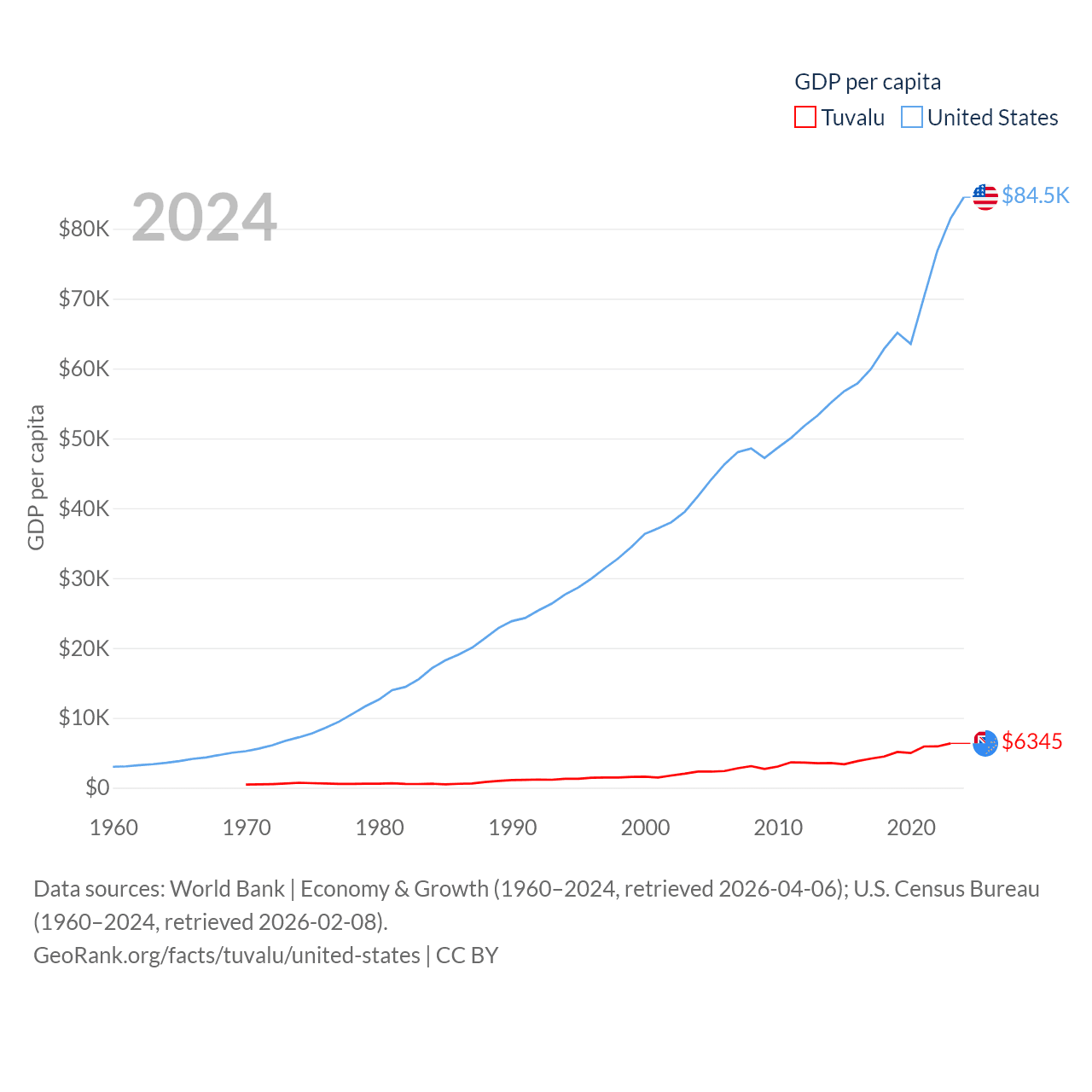 By GDP, Tuvalu ranks 196/197 ($62.3M) and The United States ranks 1/197 ($28.8T). By GDP per capita, Tuvalu ranks 110/197 ($6,345), while The United States ranks 10/197 ($84,534).