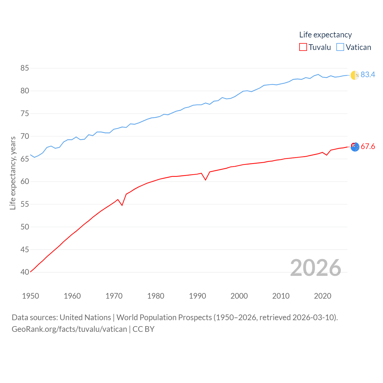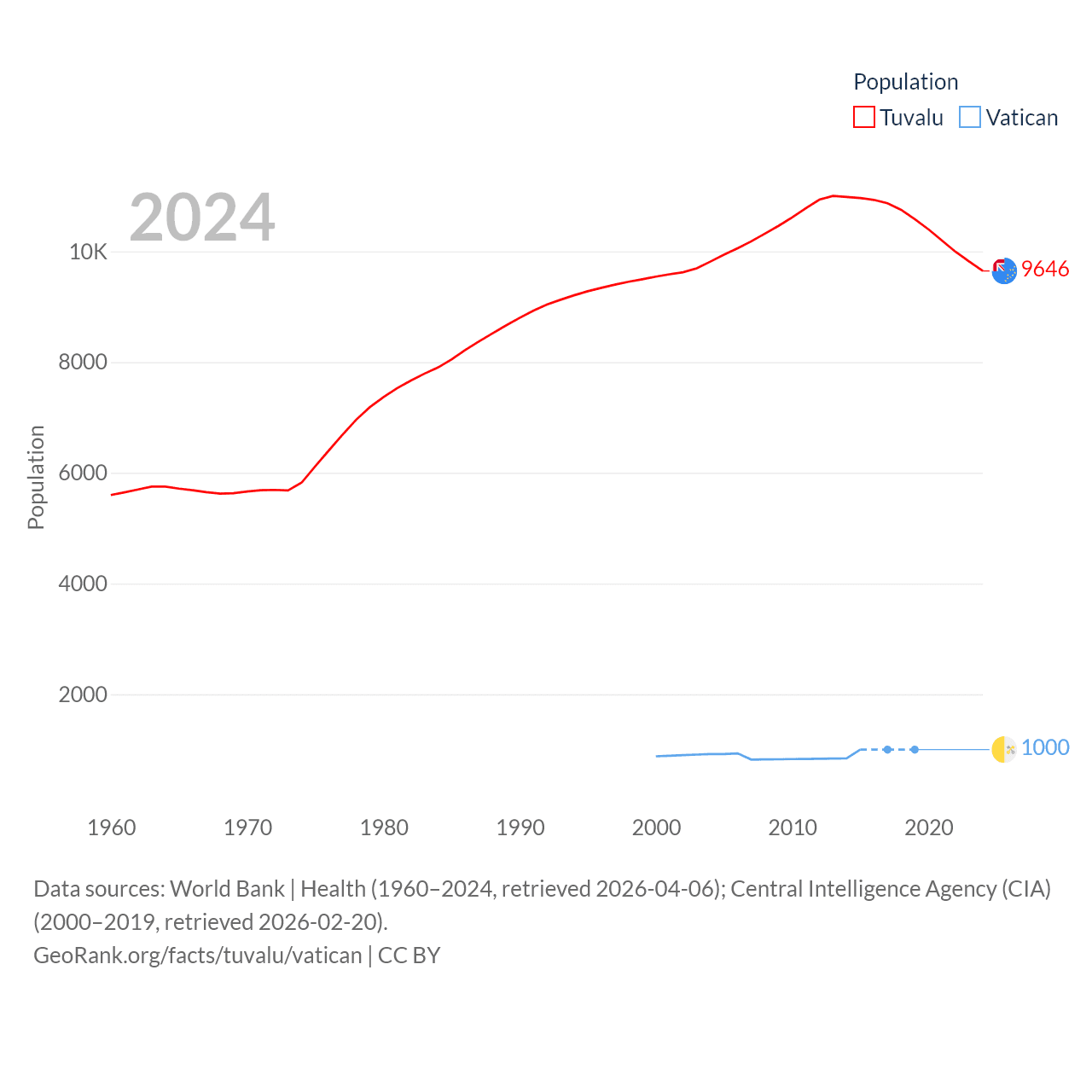Tuvalu has a population of 9.65K (ranked 196/197), compared with 1K in The Vatican (ranked 197/197). Tuvalu's land area is 11.6 sq mi versus 0.17 sq mi for The Vatican (ranked 194th vs. 197th).