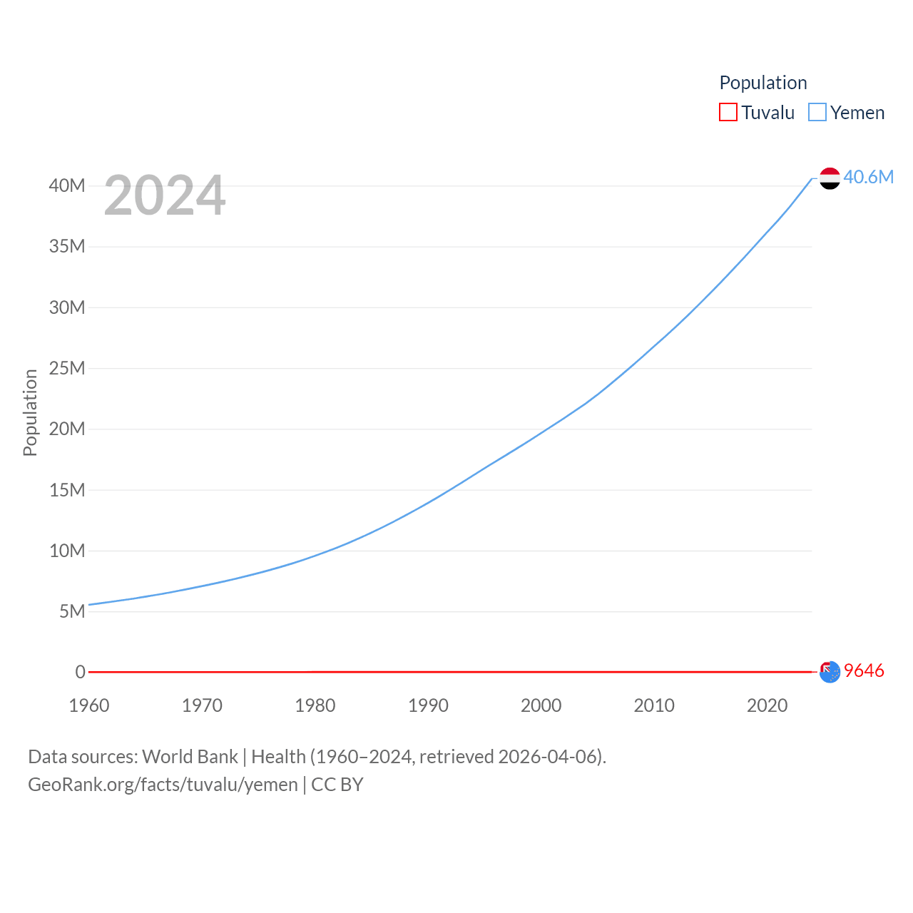 Tuvalu has a population of 9.65K (ranked 196/197), compared with 40.6M in Yemen (ranked 38/197). Tuvalu's land area is 11.6 sq mi versus 203,850 sq mi for Yemen (ranked 194th vs. 49th).