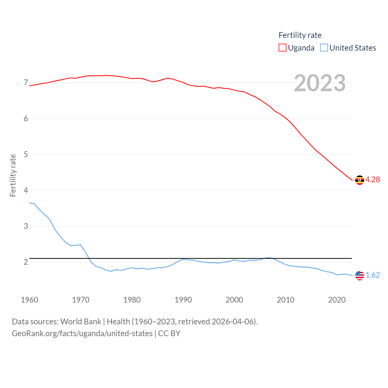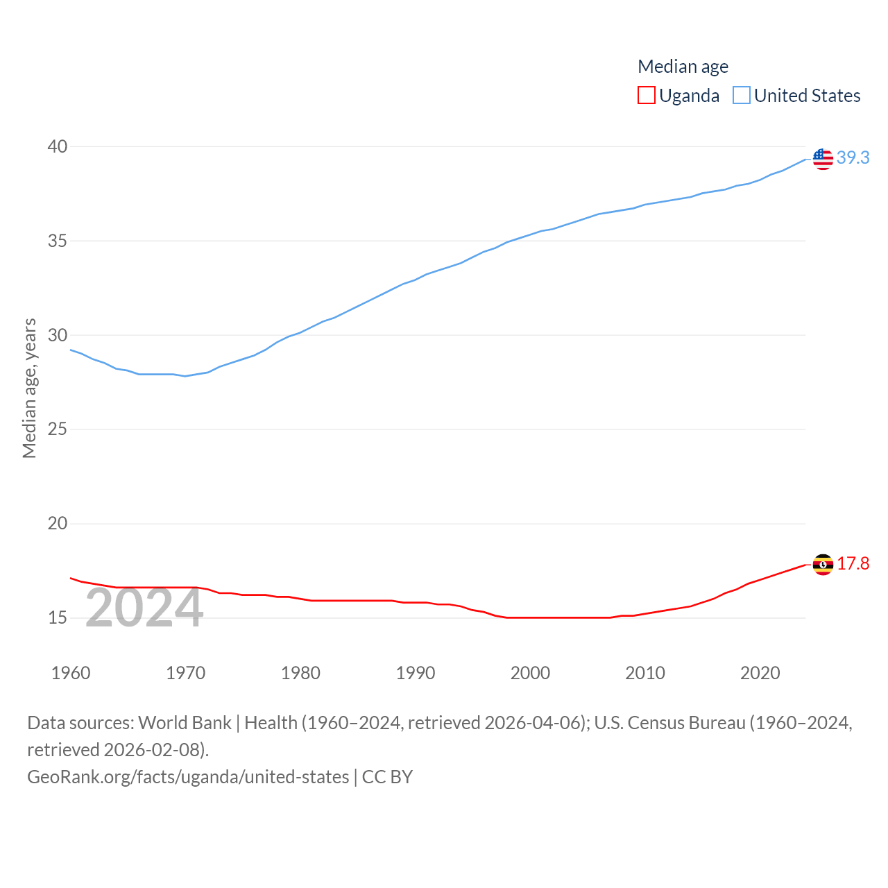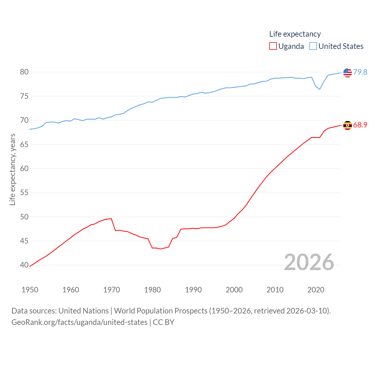 Uganda has a population of 50M (ranked 31/197), compared with 342M in The United States (ranked 3/197). Uganda's land area is 77,421 sq mi versus 3,531,839 sq mi for The United States (ranked 84th vs. 3rd).