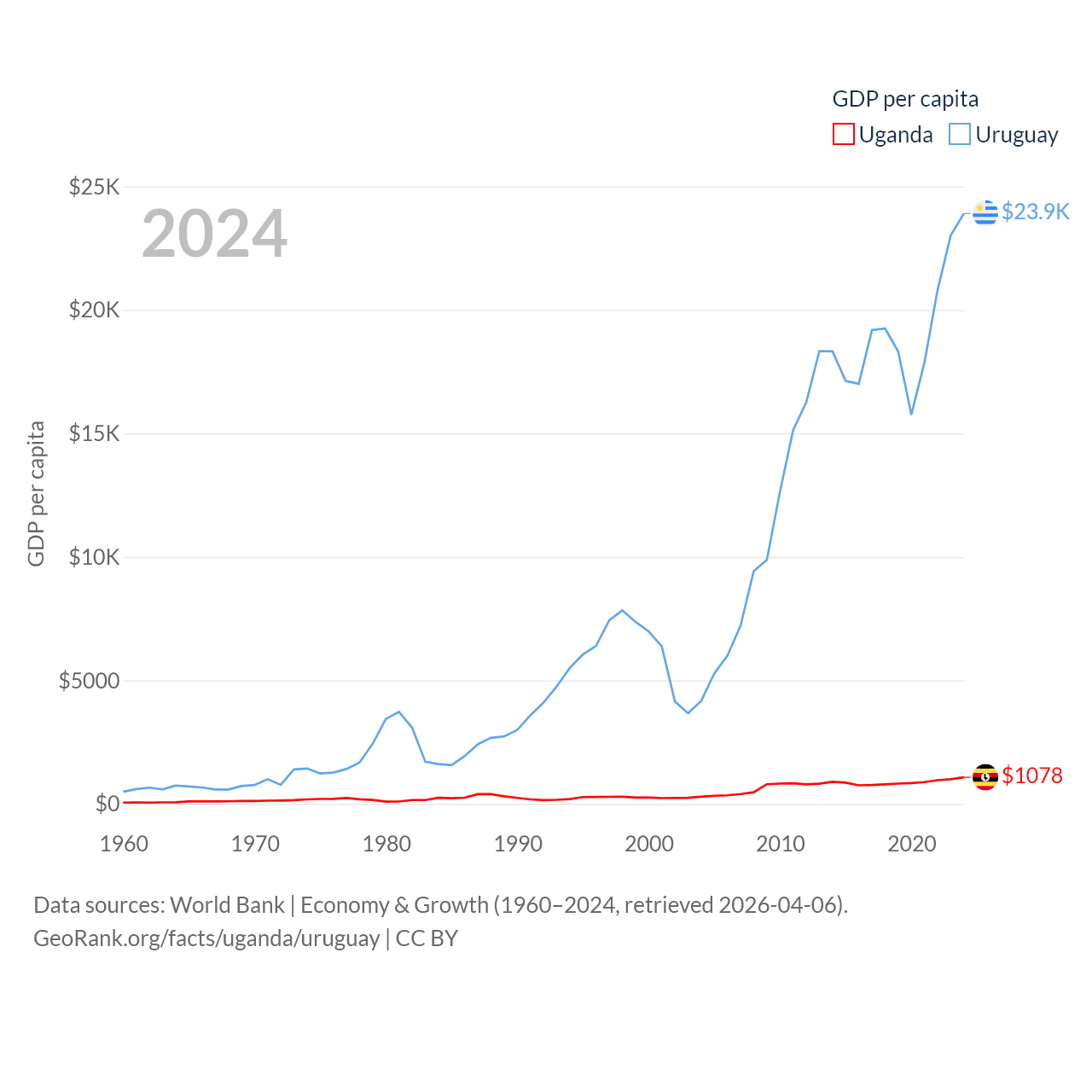By GDP, Uganda ranks 89/197 ($53.9B) and Uruguay ranks 81/197 ($81B). By GDP per capita, Uganda ranks 176/197 ($1,078), while Uruguay ranks 52/197 ($23,907).