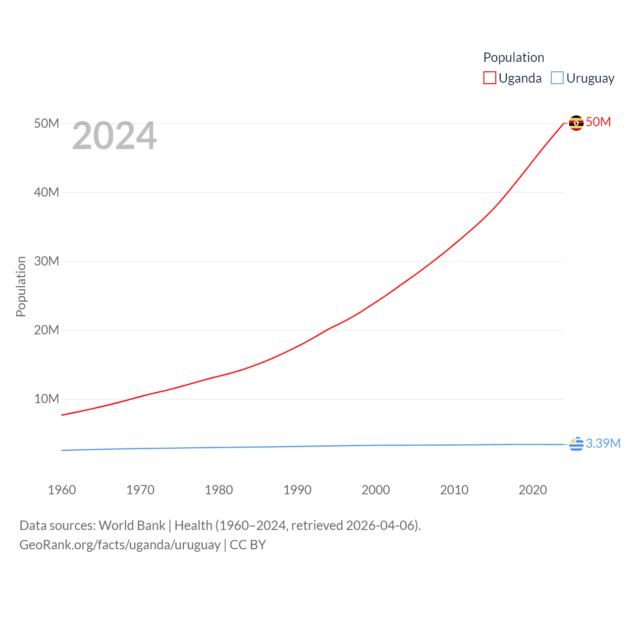 Uganda has a population of 50M (ranked 31/197), compared with 3.39M in Uruguay (ranked 133/197). Uganda's land area is 77,421 sq mi versus 67,576 sq mi for Uruguay (ranked 84th vs. 89th).