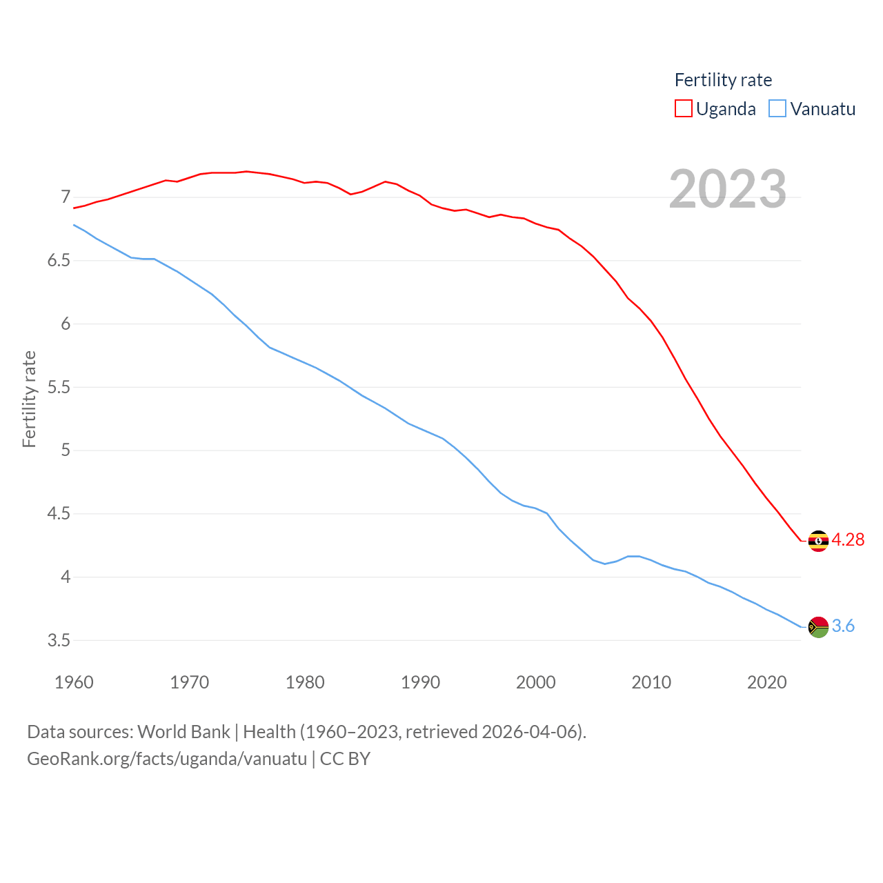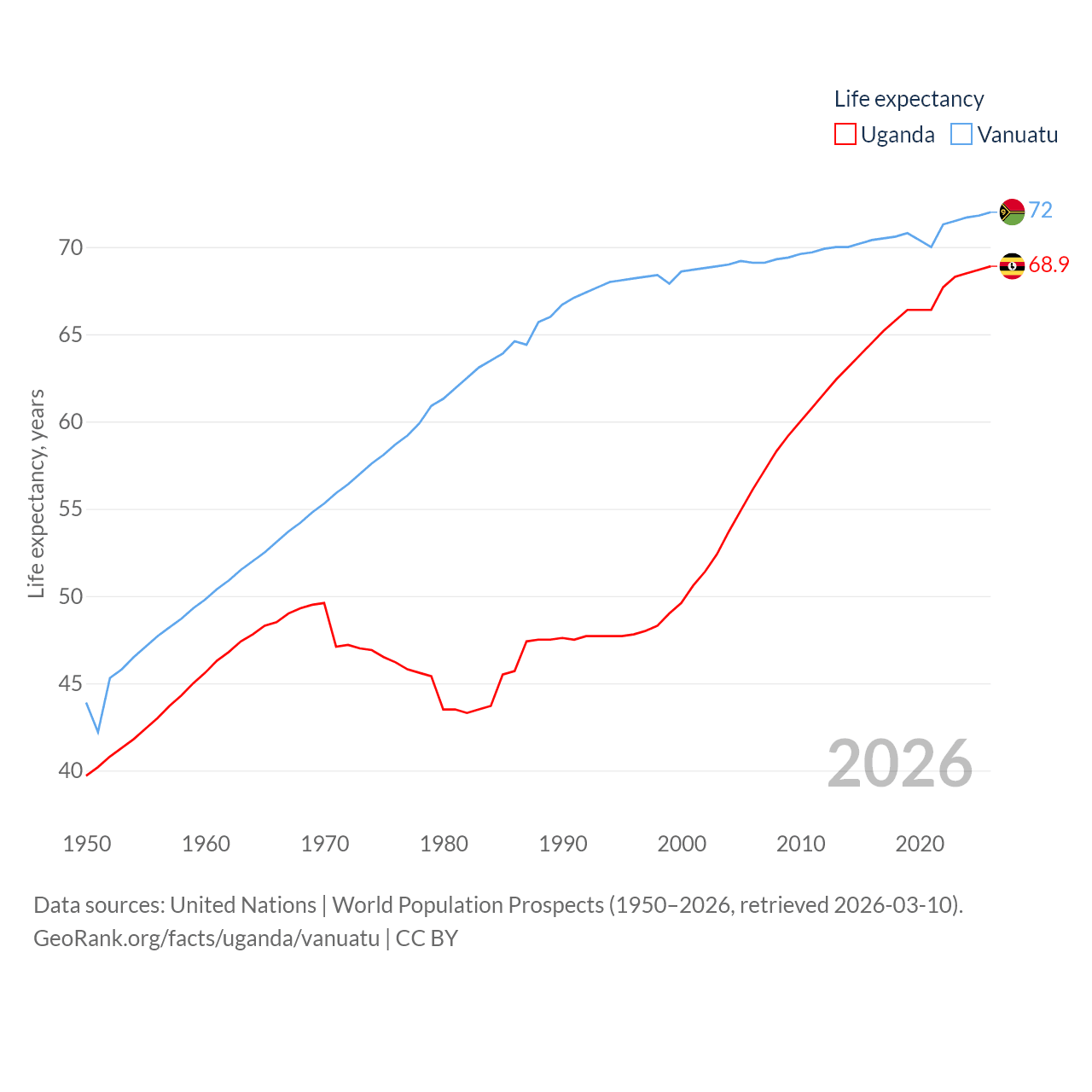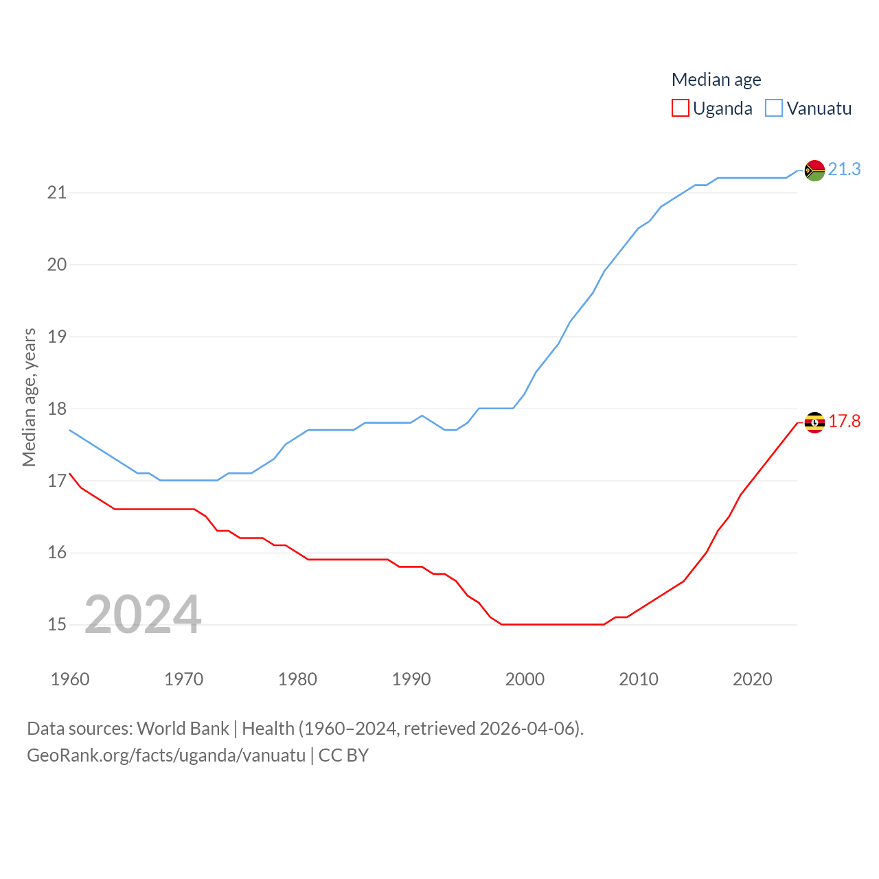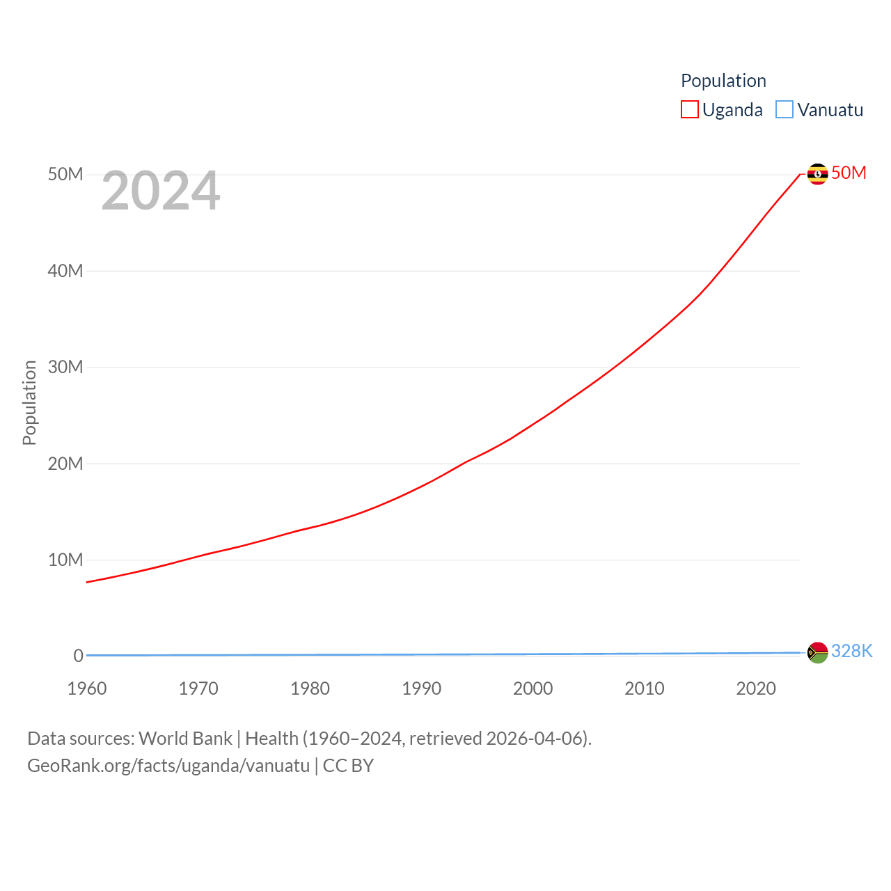 Uganda has a population of 50M (ranked 31/197), compared with 328K in Vanuatu (ranked 174/197). Uganda's land area is 77,421 sq mi versus 4,707 sq mi for Vanuatu (ranked 84th vs. 157th).