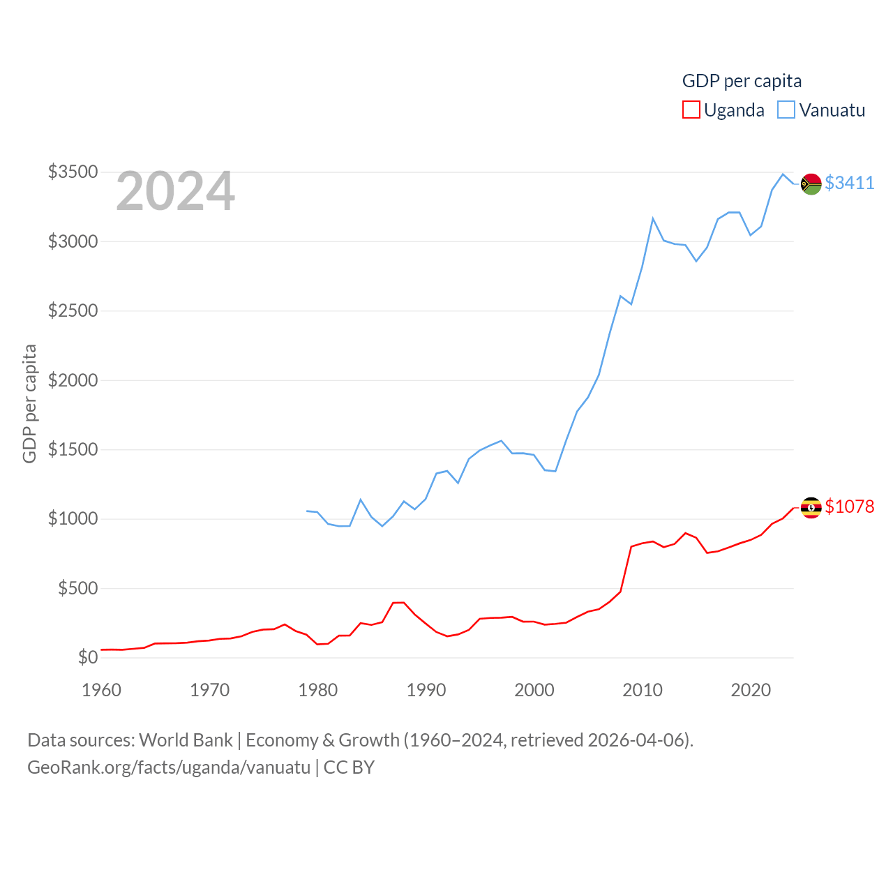By GDP, Uganda ranks 89/197 ($53.9B) and Vanuatu ranks 188/197 ($1.12B). By GDP per capita, Uganda ranks 176/197 ($1,078), while Vanuatu ranks 137/197 ($3,411).