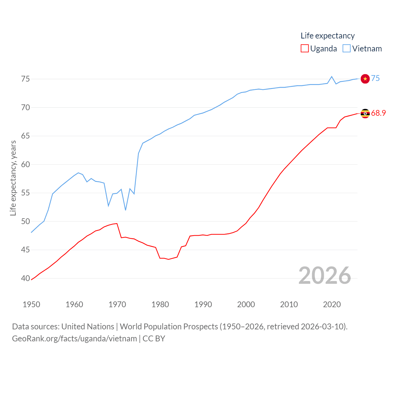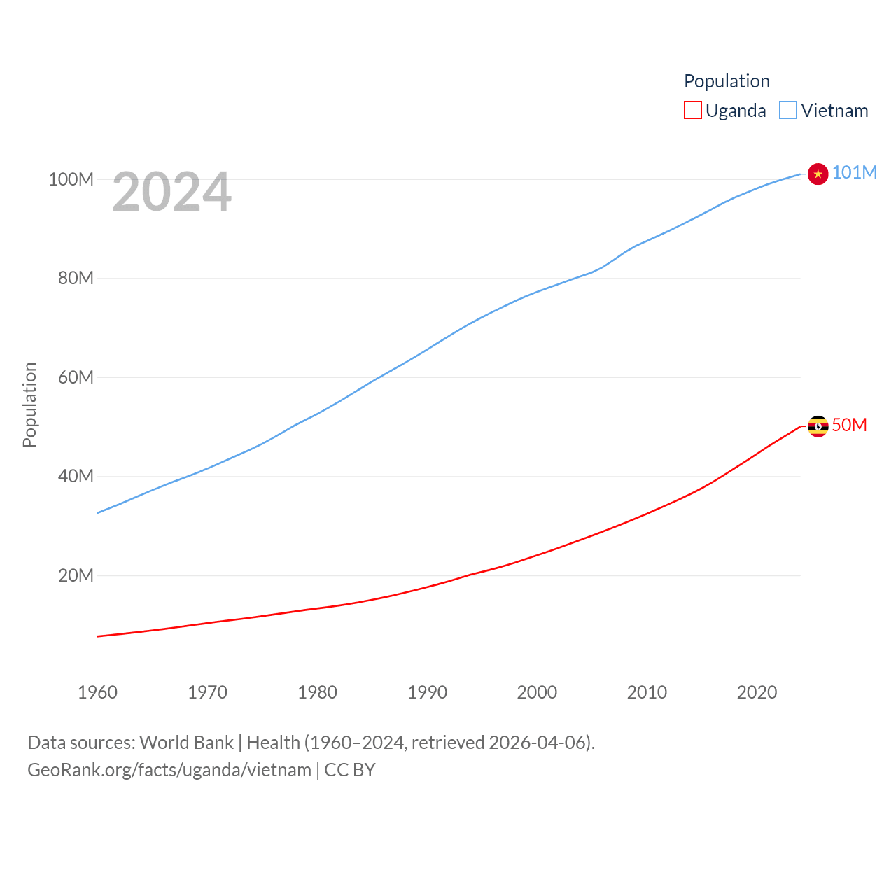 Uganda has a population of 50M (ranked 31/197), compared with 101M in Vietnam (ranked 16/197). Uganda's land area is 77,421 sq mi versus 121,016 sq mi for Vietnam (ranked 84th vs. 67th).