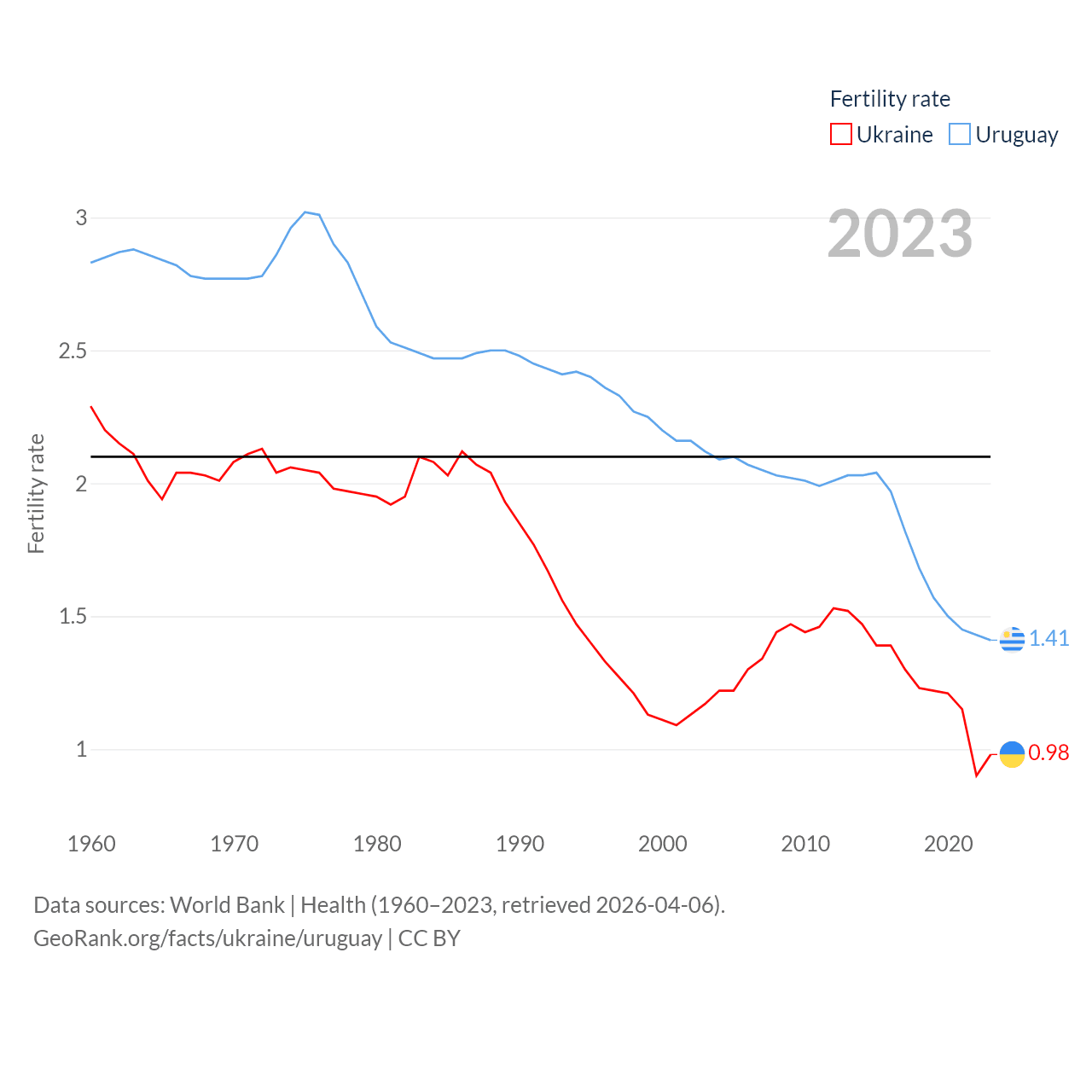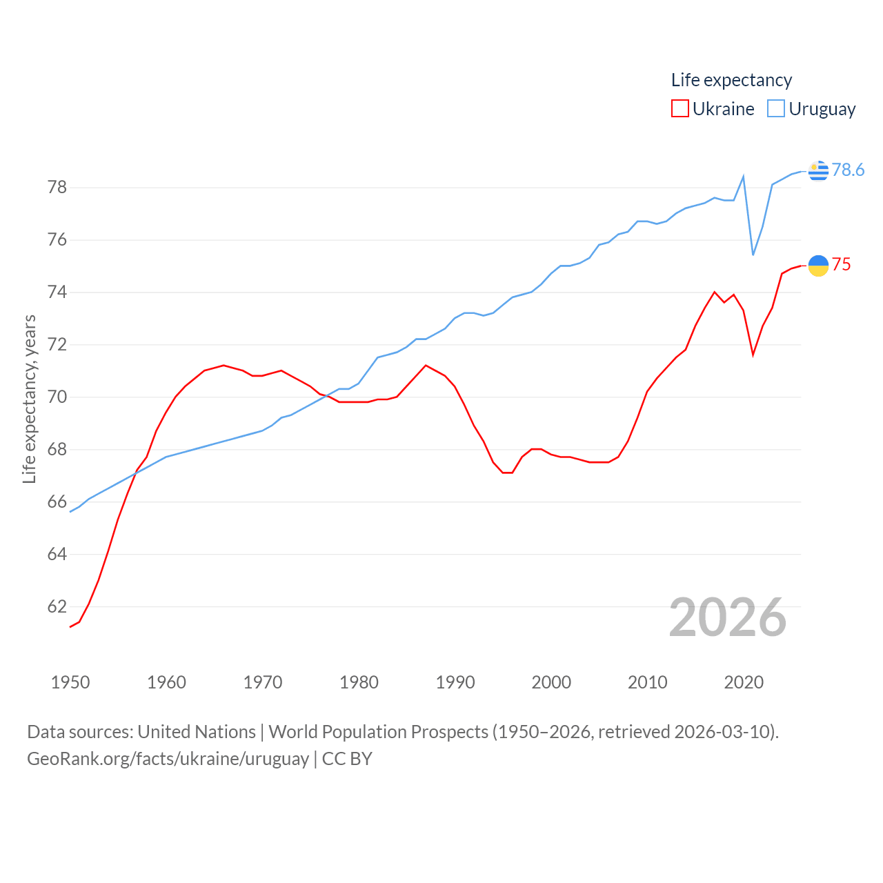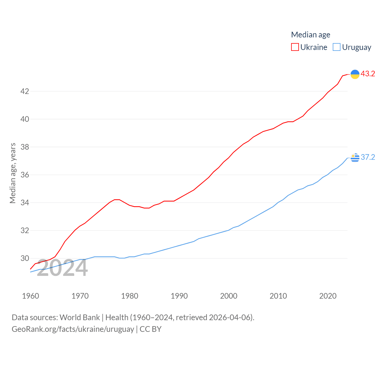 Ukraine has a population of 37.9M (ranked 41/197), compared with 3.39M in Uruguay (ranked 133/197). Ukraine's land area is 223,708 sq mi versus 67,576 sq mi for Uruguay (ranked 46th vs. 89th).