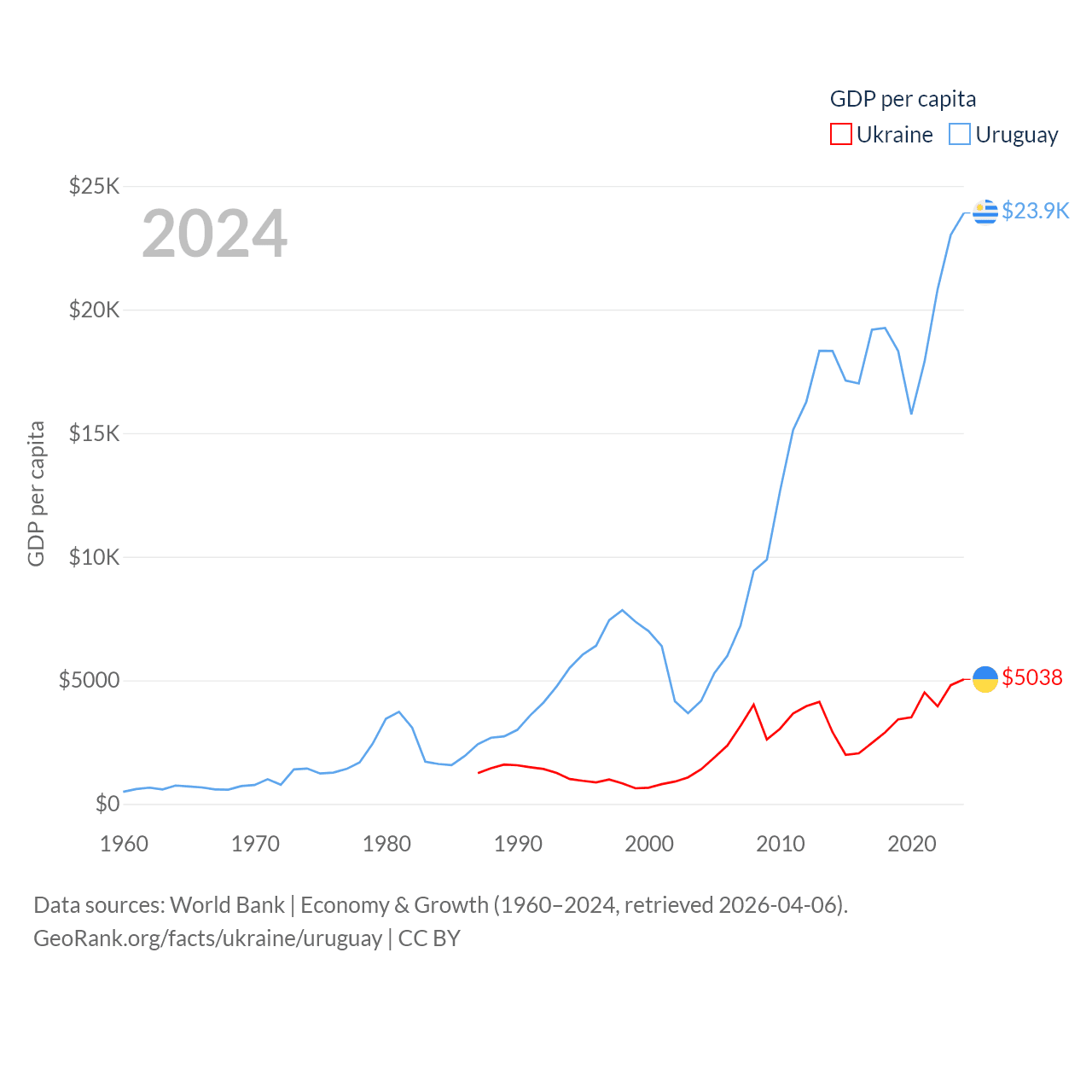 By GDP, Ukraine ranks 57/197 ($191B) and Uruguay ranks 81/197 ($81B). By GDP per capita, Ukraine ranks 120/197 ($5,038), while Uruguay ranks 52/197 ($23,907).
