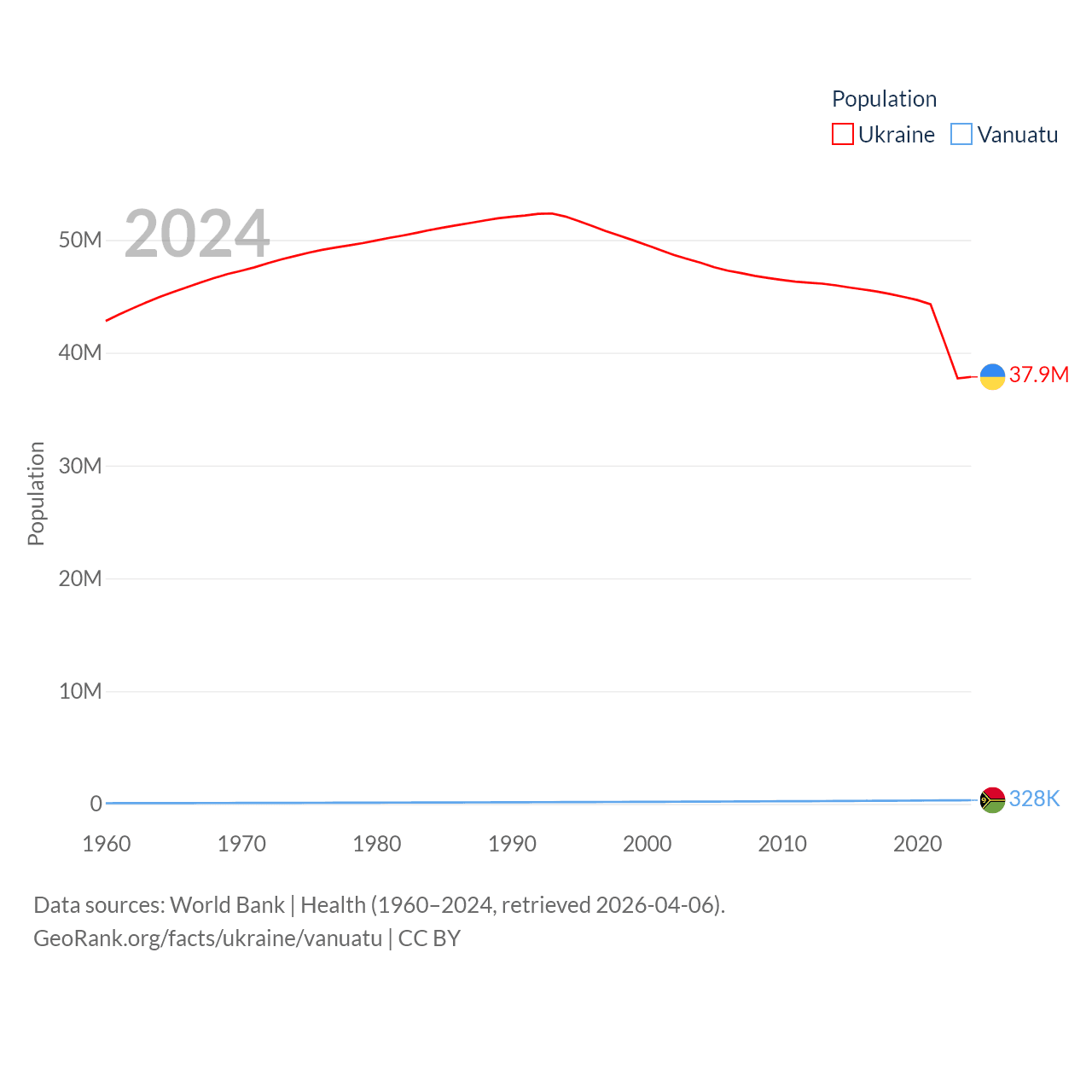 Ukraine has a population of 37.9M (ranked 41/197), compared with 328K in Vanuatu (ranked 174/197). Ukraine's land area is 223,708 sq mi versus 4,707 sq mi for Vanuatu (ranked 46th vs. 157th).