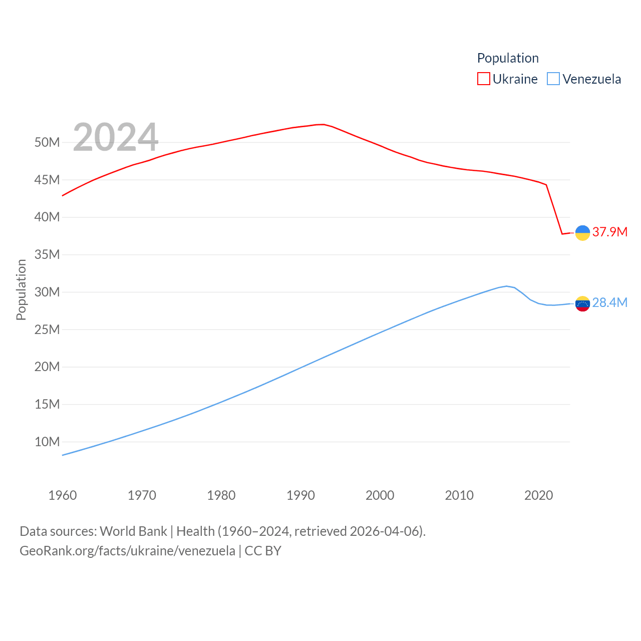 Ukraine has a population of 37.9M (ranked 41/197), compared with 28.4M in Venezuela (ranked 53/197). Ukraine's land area is 223,708 sq mi versus 340,561 sq mi for Venezuela (ranked 46th vs. 32nd).