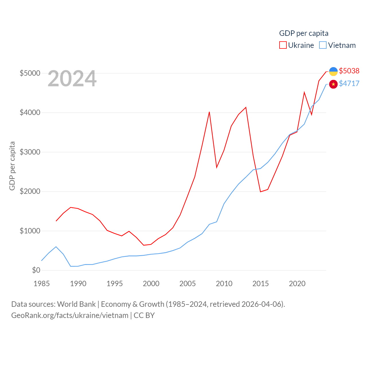 Data sources: World Bank | Economy & Growth (1985–2024, retrieved 2026-04-06).