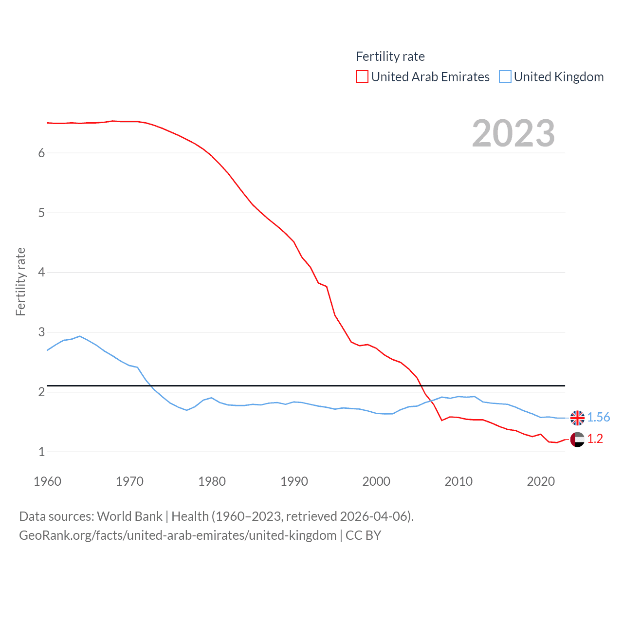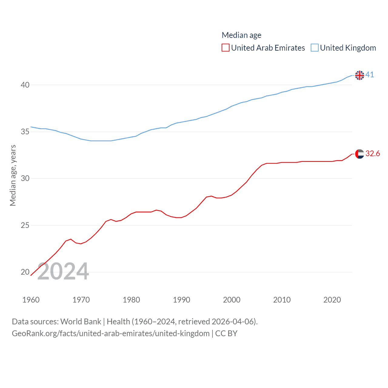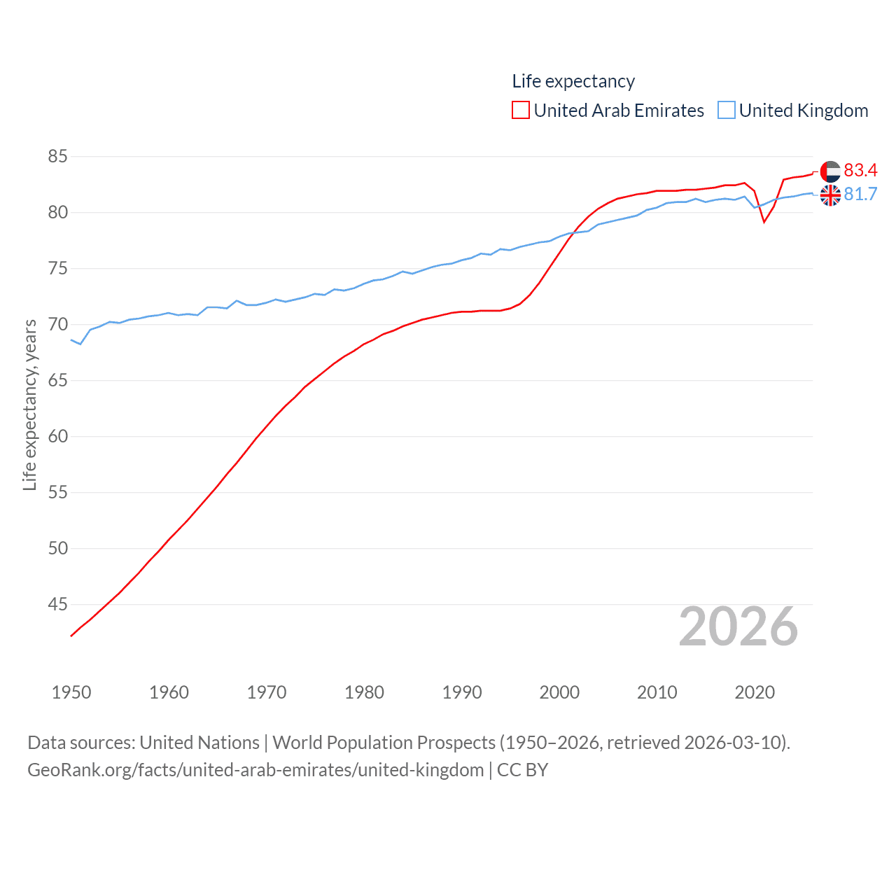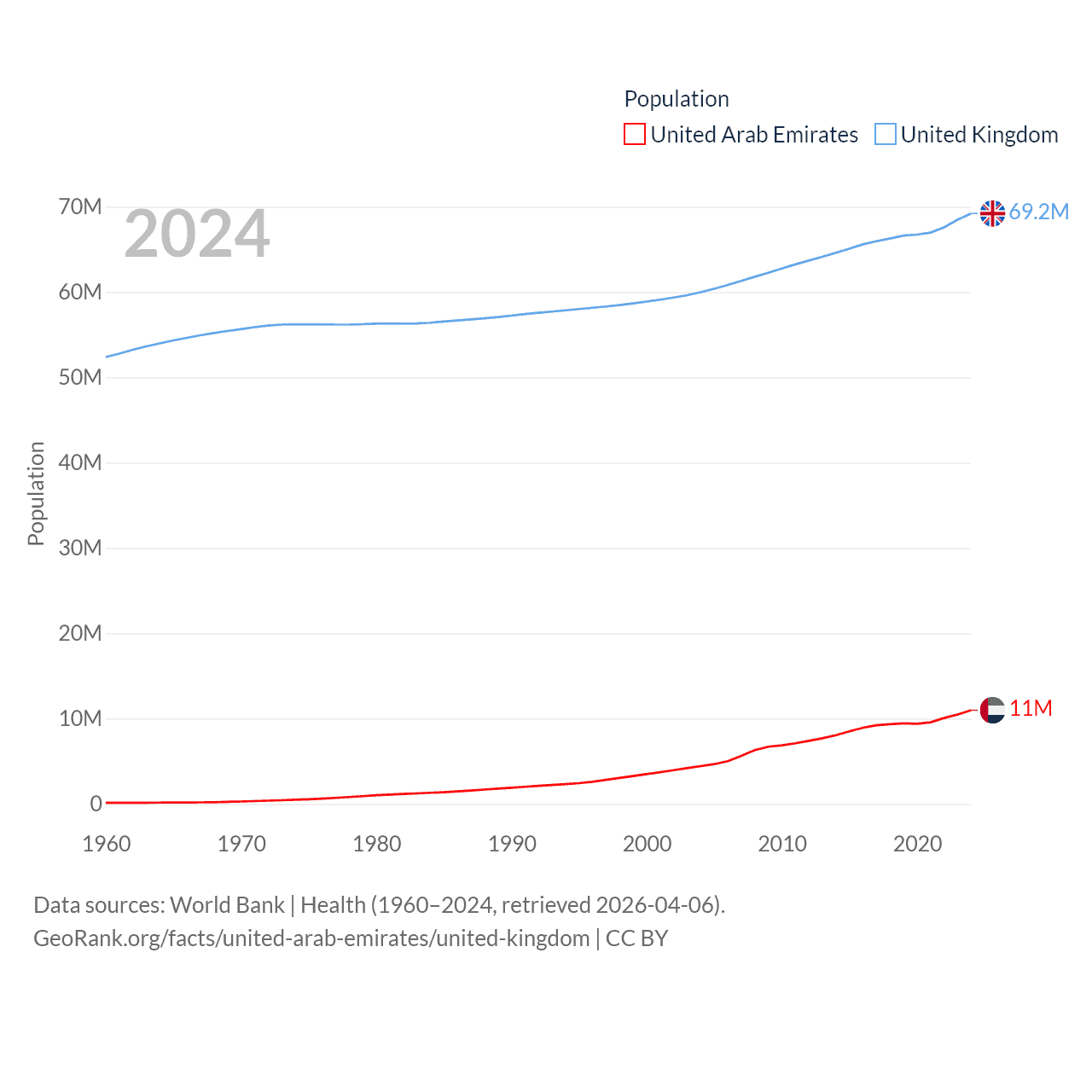 The United Arab Emirates has a population of 11M (ranked 86/197), compared with 69.2M in The United Kingdom (ranked 21/197). The United Arab Emirates' land area is 27,421 sq mi versus 93,410 sq mi for The United Kingdom (ranked 117th vs. 78th).