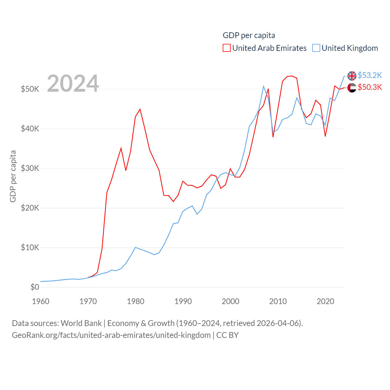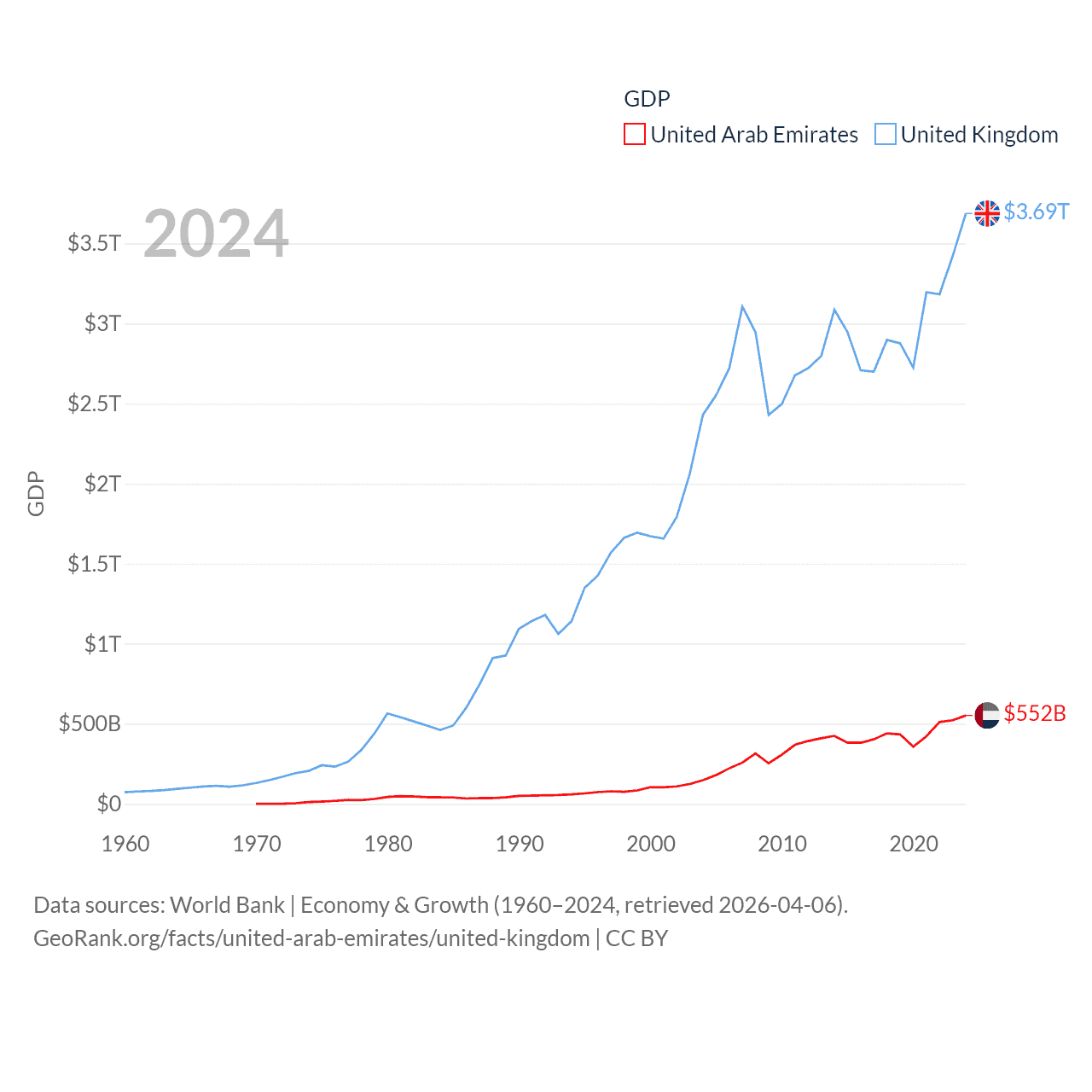 By GDP, The United Arab Emirates ranks 27/197 ($552B) and The United Kingdom ranks 6/197 ($3.69T). By GDP per capita, The United Arab Emirates ranks 24/197 ($50,274), while The United Kingdom ranks 22/197 ($53,246).