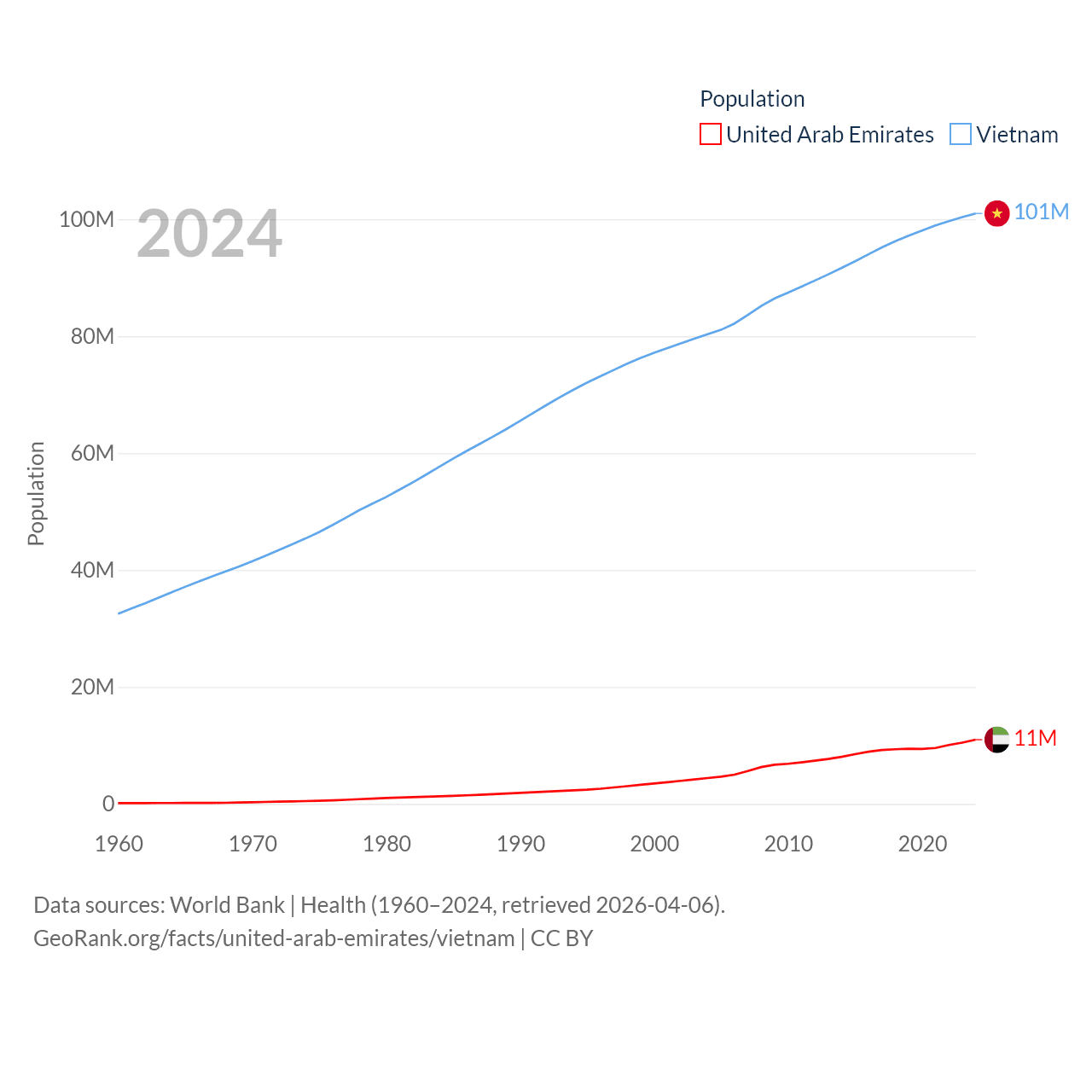 The United Arab Emirates has a population of 11M (ranked 86/197), compared with 101M in Vietnam (ranked 16/197). The United Arab Emirates' land area is 27,421 sq mi versus 121,016 sq mi for Vietnam (ranked 117th vs. 67th).