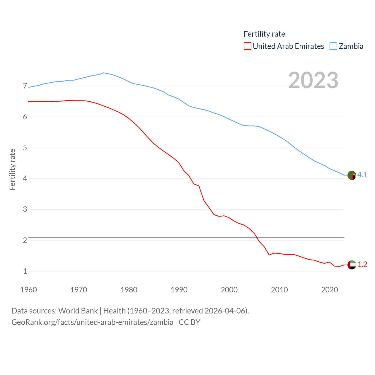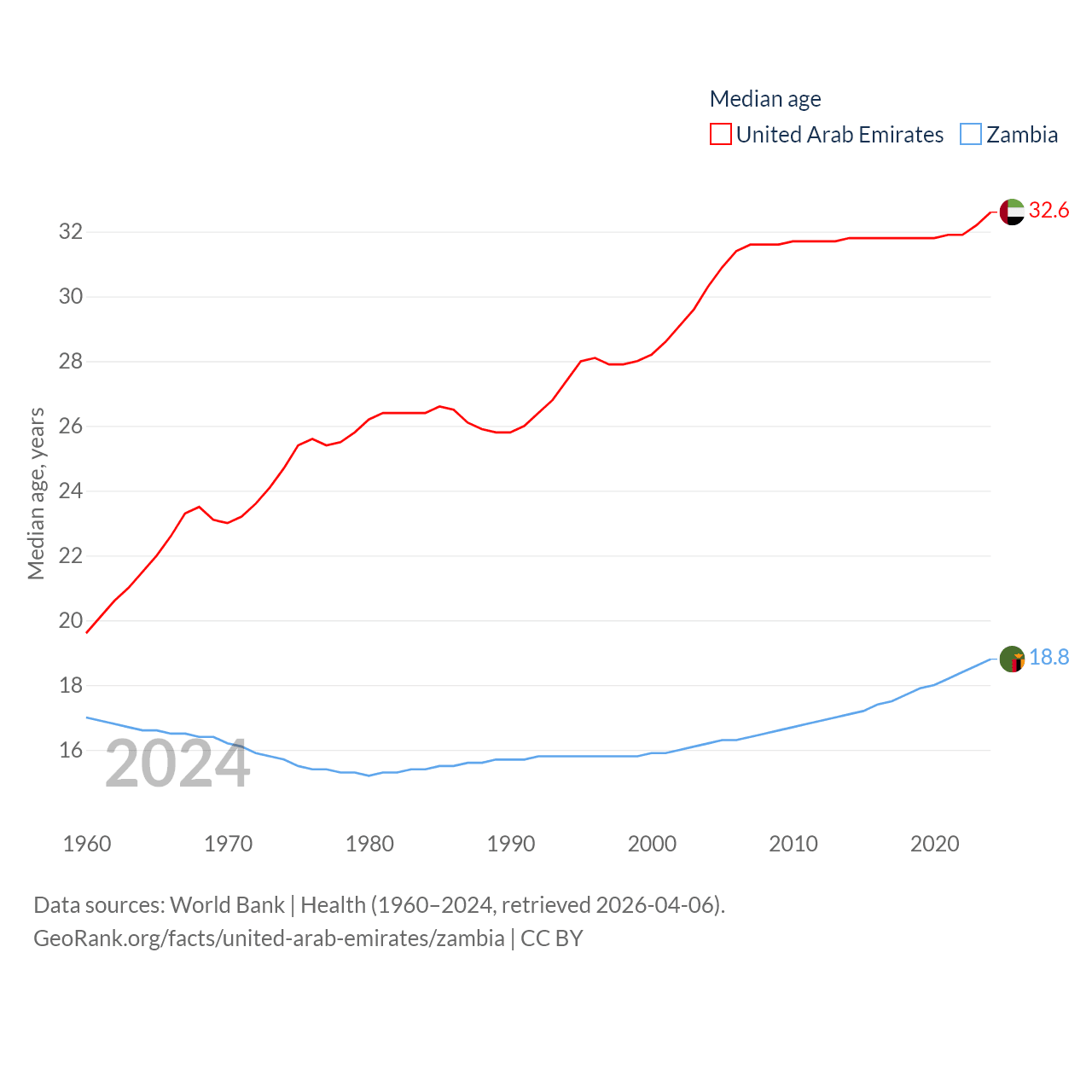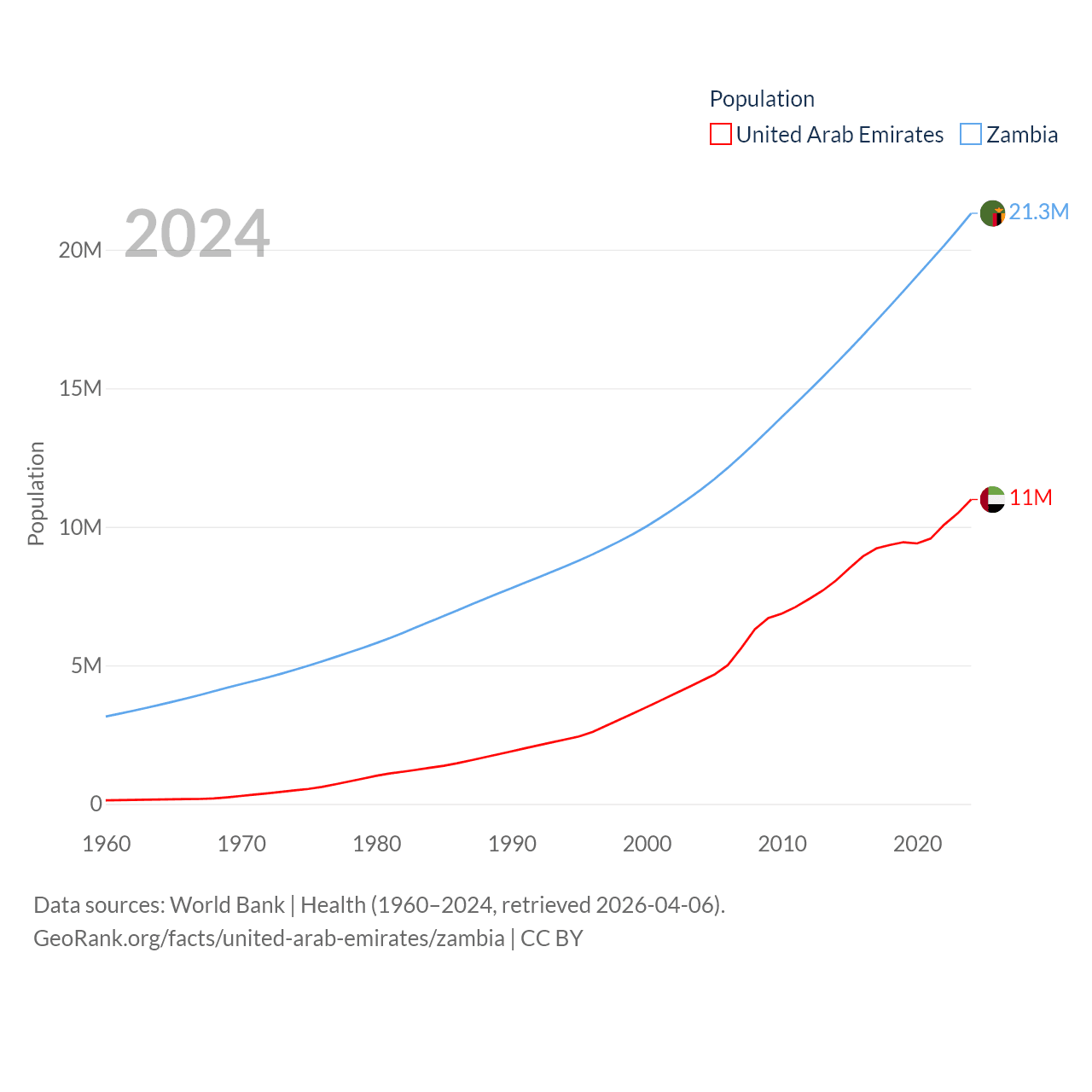 The United Arab Emirates has a population of 11M (ranked 86/197), compared with 21.3M in Zambia (ranked 63/197). The United Arab Emirates' land area is 27,421 sq mi versus 287,024 sq mi for Zambia (ranked 117th vs. 37th).