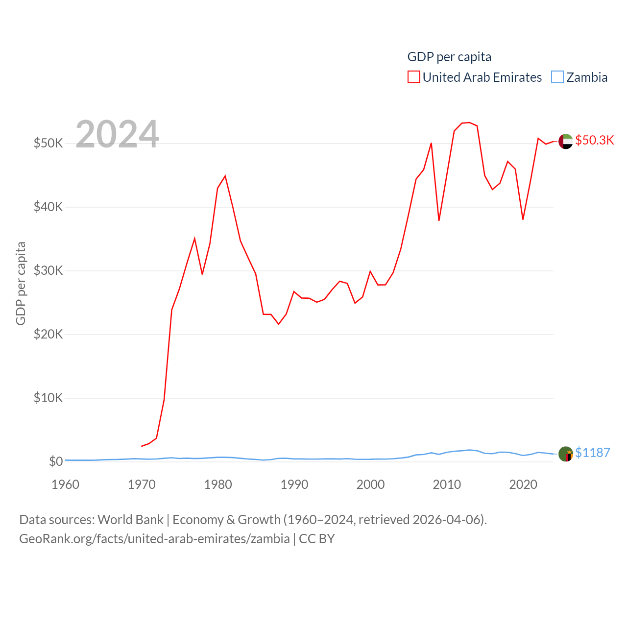 By GDP, The United Arab Emirates ranks 27/197 ($552B) and Zambia ranks 116/197 ($25.3B). By GDP per capita, The United Arab Emirates ranks 24/197 ($50,274), while Zambia ranks 169/197 ($1,187).