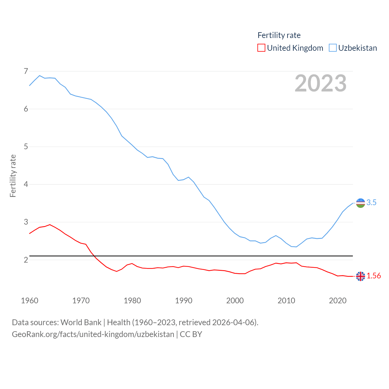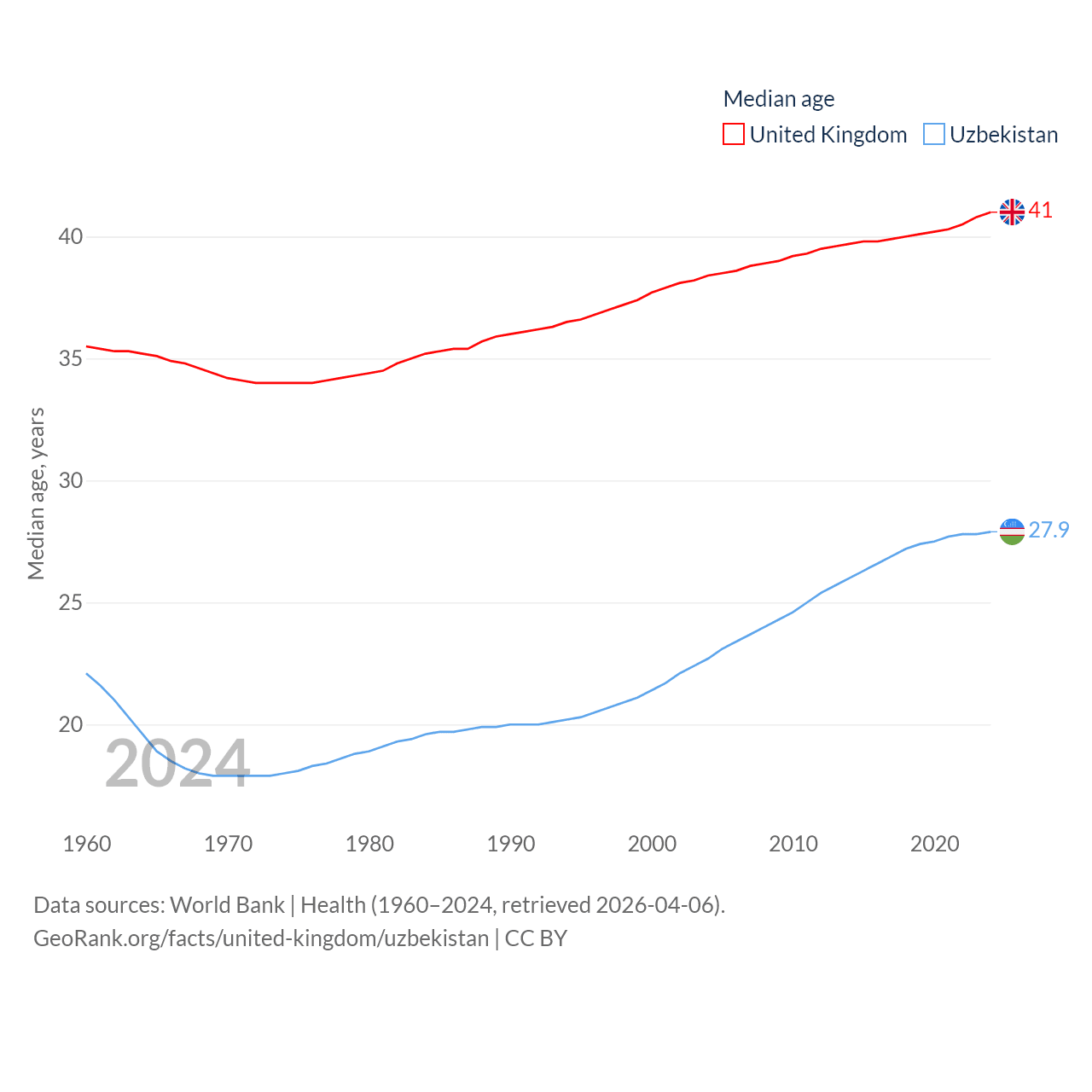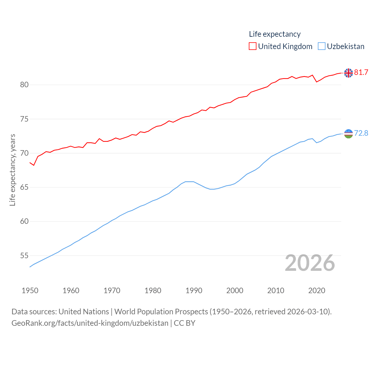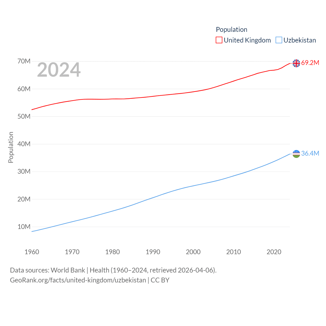 The United Kingdom has a population of 69.2M (ranked 21/197), compared with 36.4M in Uzbekistan (ranked 43/197). The United Kingdom's land area is 93,410 sq mi versus 170,136 sq mi for Uzbekistan (ranked 78th vs. 56th).