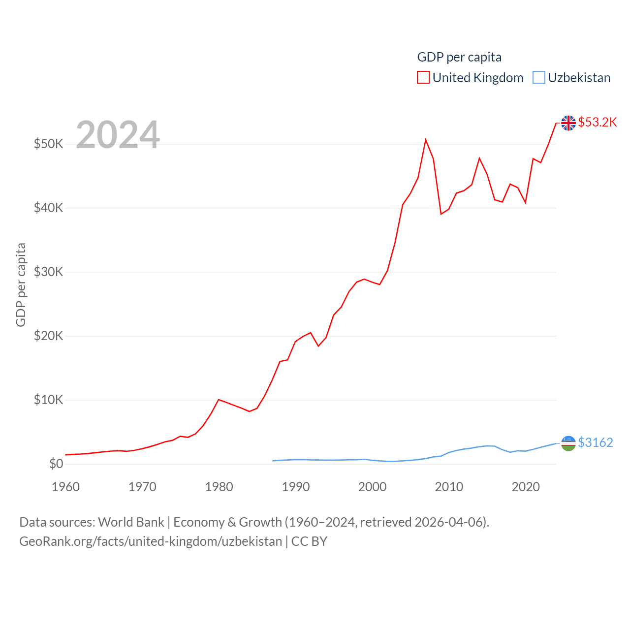 By GDP, The United Kingdom ranks 6/197 ($3.69T) and Uzbekistan ranks 66/197 ($115B). By GDP per capita, The United Kingdom ranks 22/197 ($53,246), while Uzbekistan ranks 139/197 ($3,162).