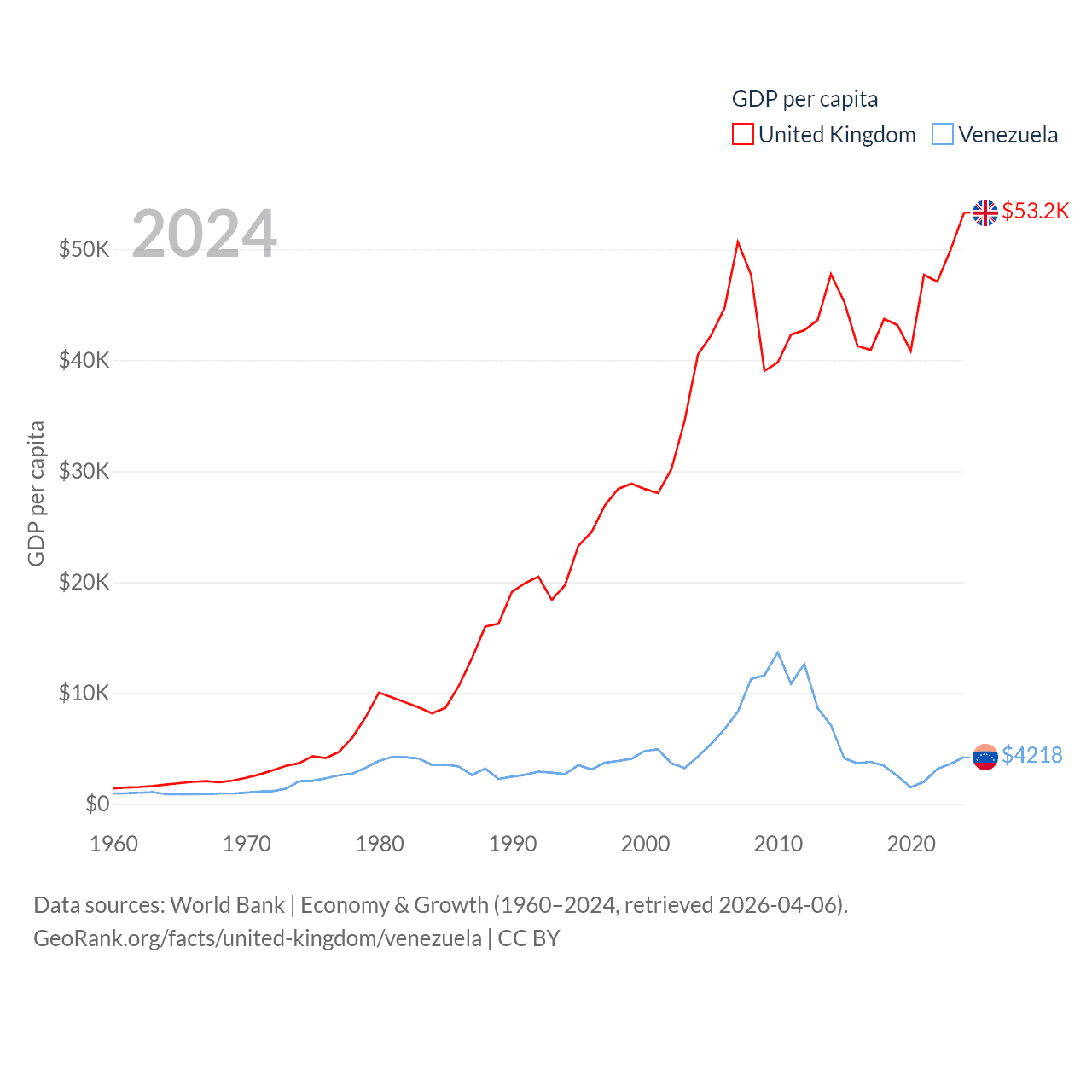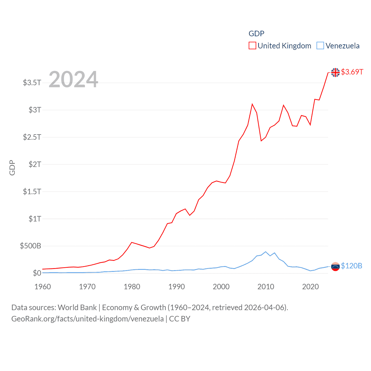 By GDP, The United Kingdom ranks 6/197 ($3.69T) and Venezuela ranks 65/197 ($120B). By GDP per capita, The United Kingdom ranks 22/197 ($53,246), while Venezuela ranks 128/197 ($4,218).