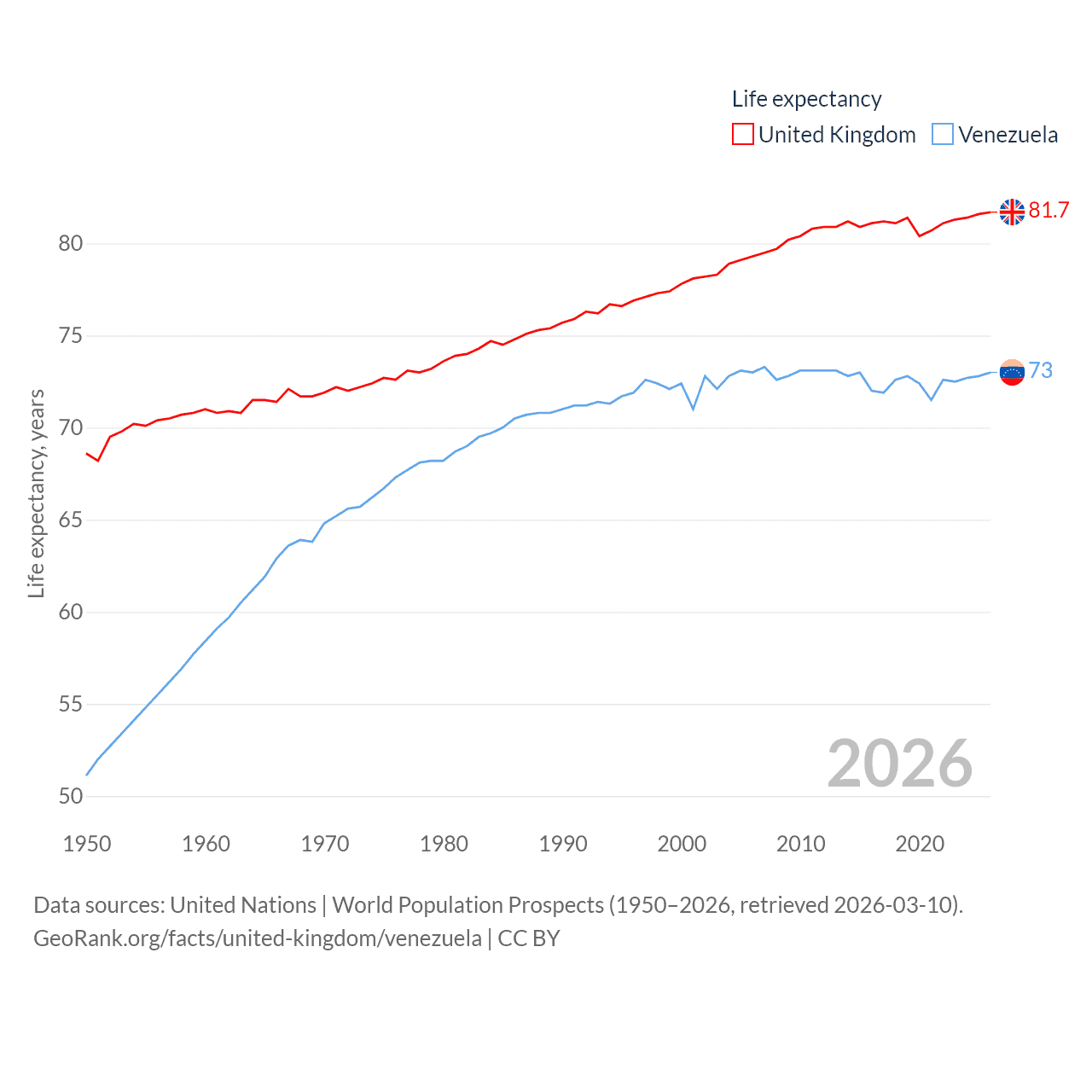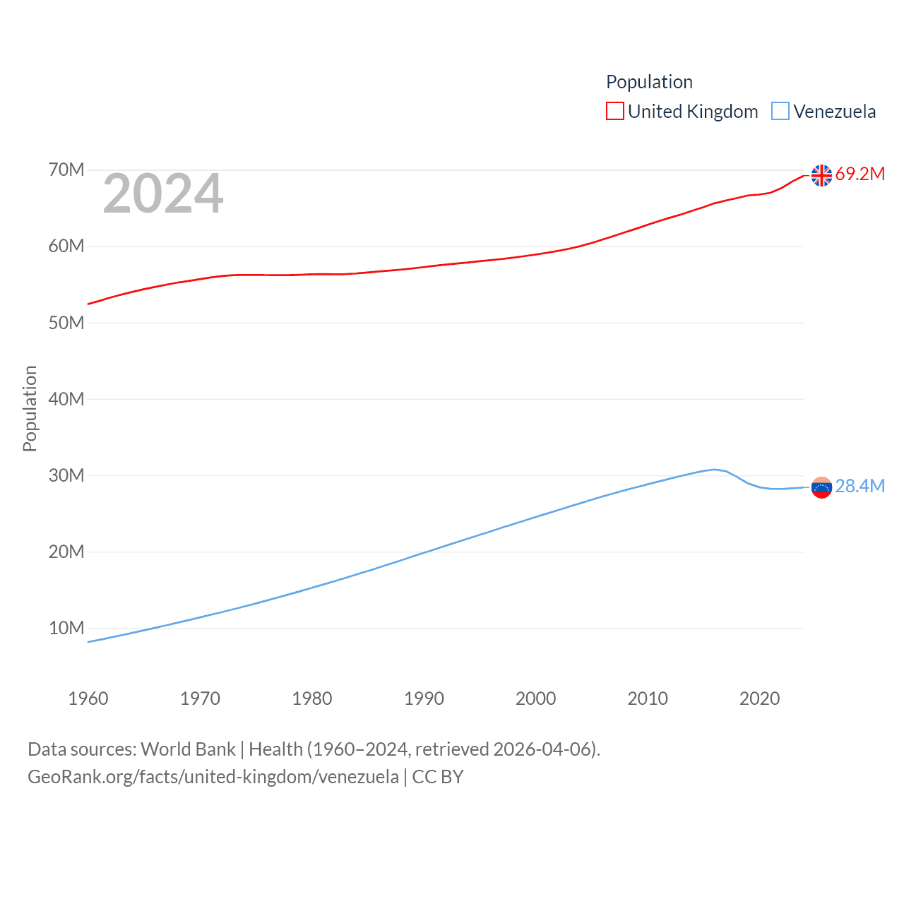 The United Kingdom has a population of 69.2M (ranked 21/197), compared with 28.4M in Venezuela (ranked 53/197). The United Kingdom's land area is 93,410 sq mi versus 340,561 sq mi for Venezuela (ranked 78th vs. 32nd).